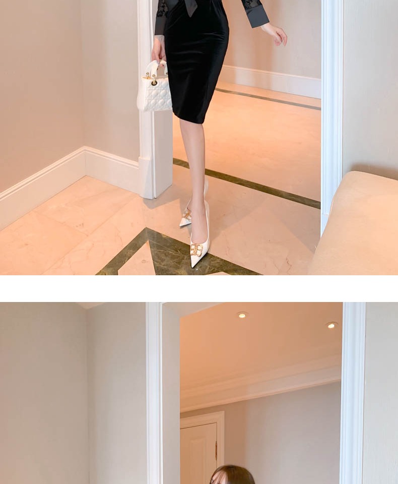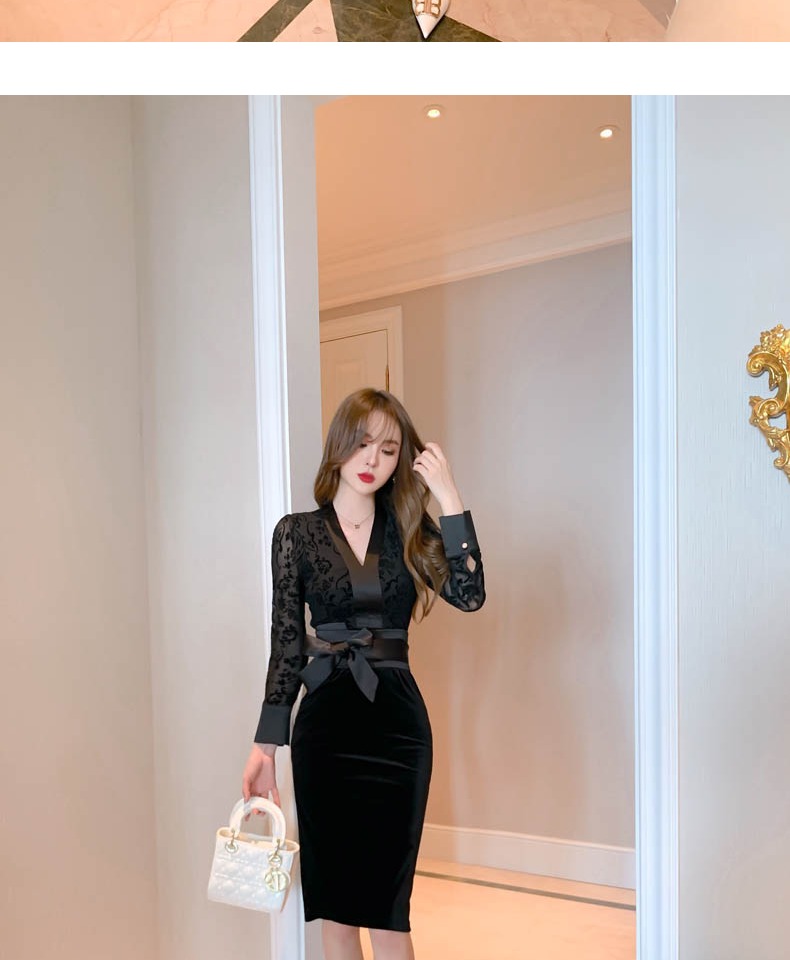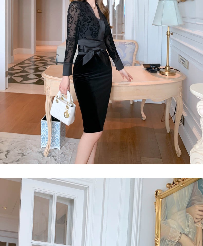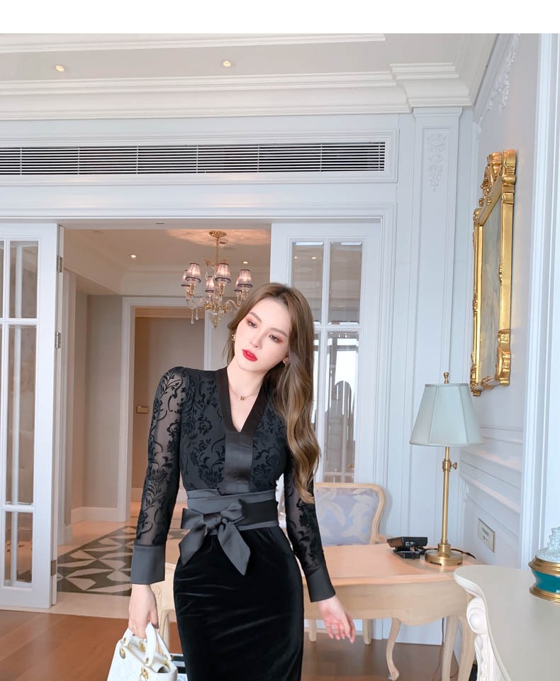 v領禮服裙女宴會絲絨氣質蕾絲綁帶連衣裙秋裝法式復古赫本包臀裙