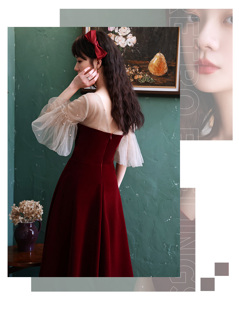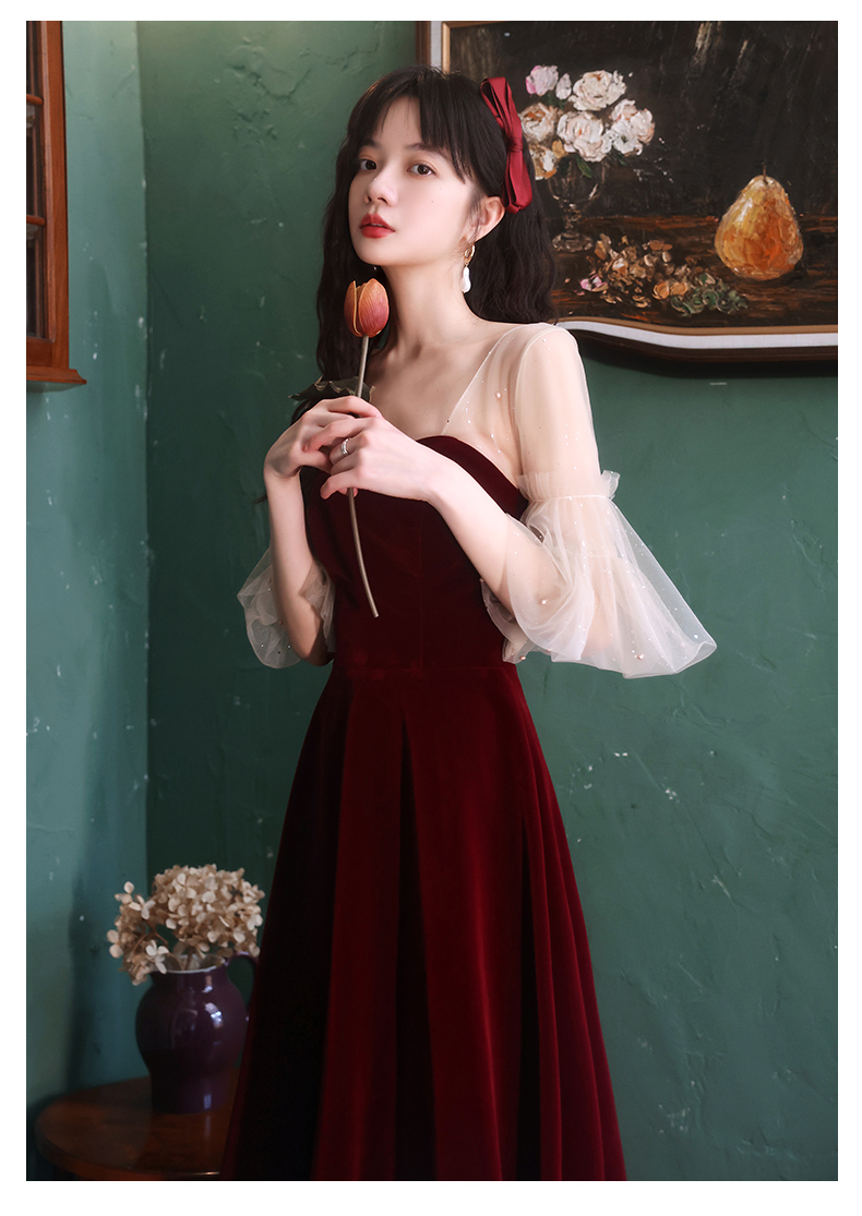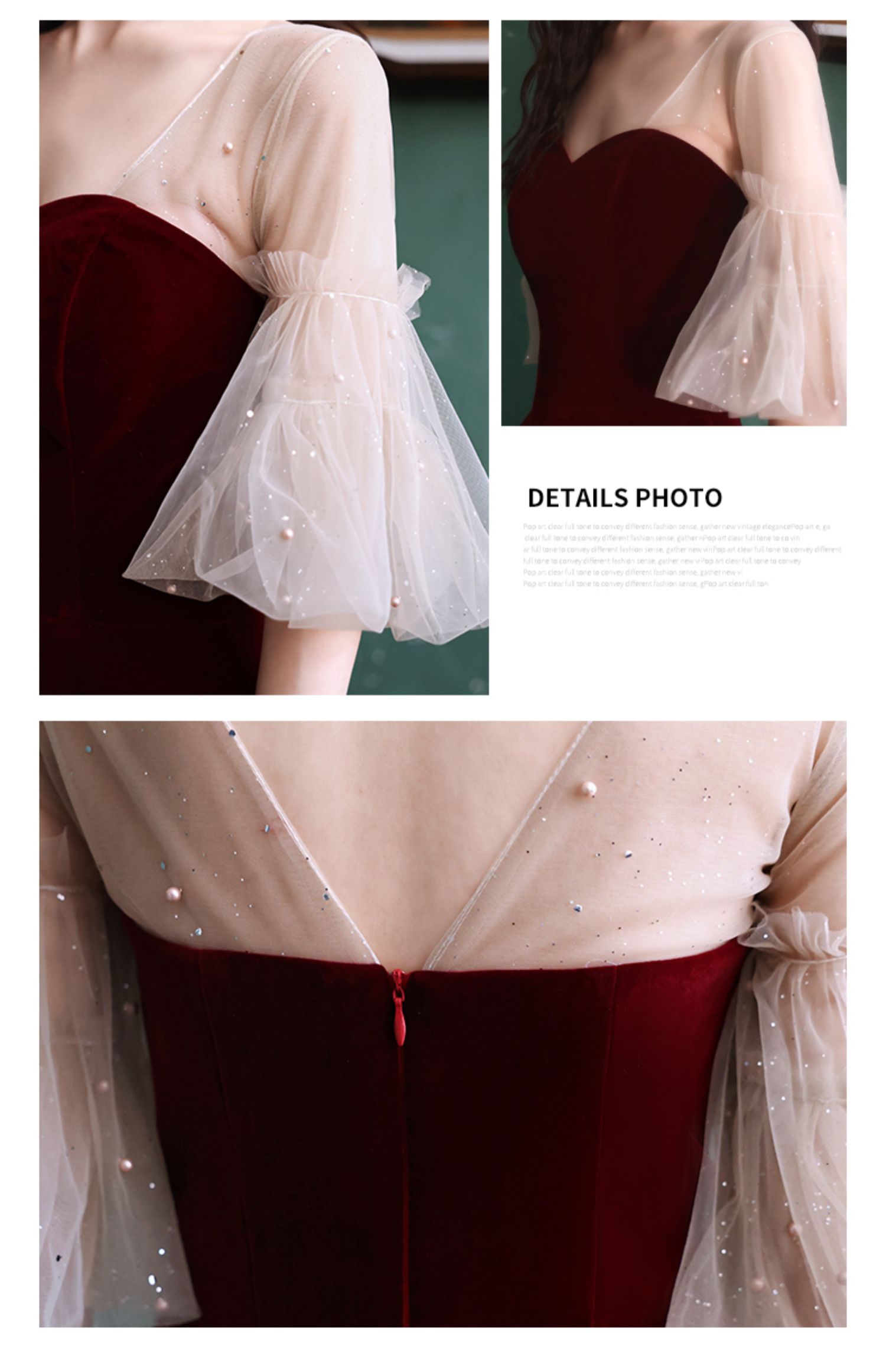 酒紅色絲絨新娘長袖晚禮服連衣裙