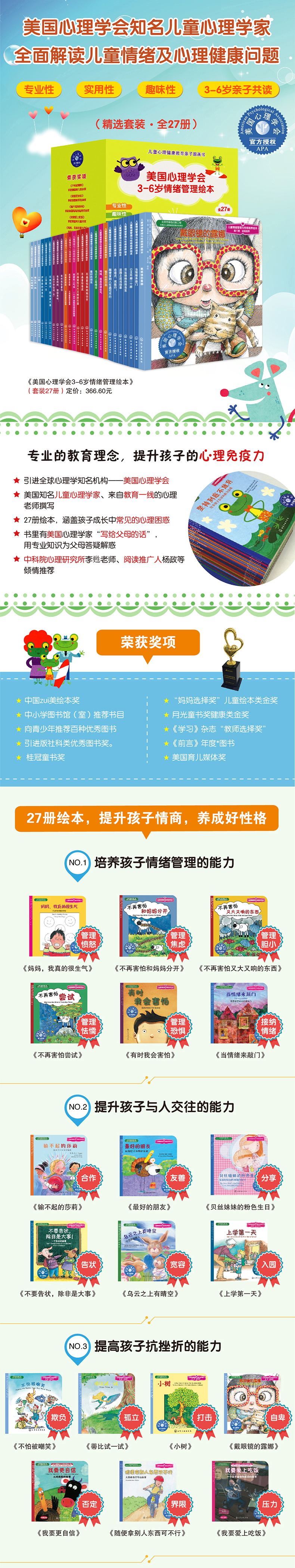 2、《美國心理學會3-6歲情緒管理繪本(套裝27冊)》包含27冊繪本,涵蓋兒童成長過程中經常遇到的27個情緒困惑,如生氣發脾氣、被嘲笑、缺乏自信、不敢嘗試、害怕犯錯等。