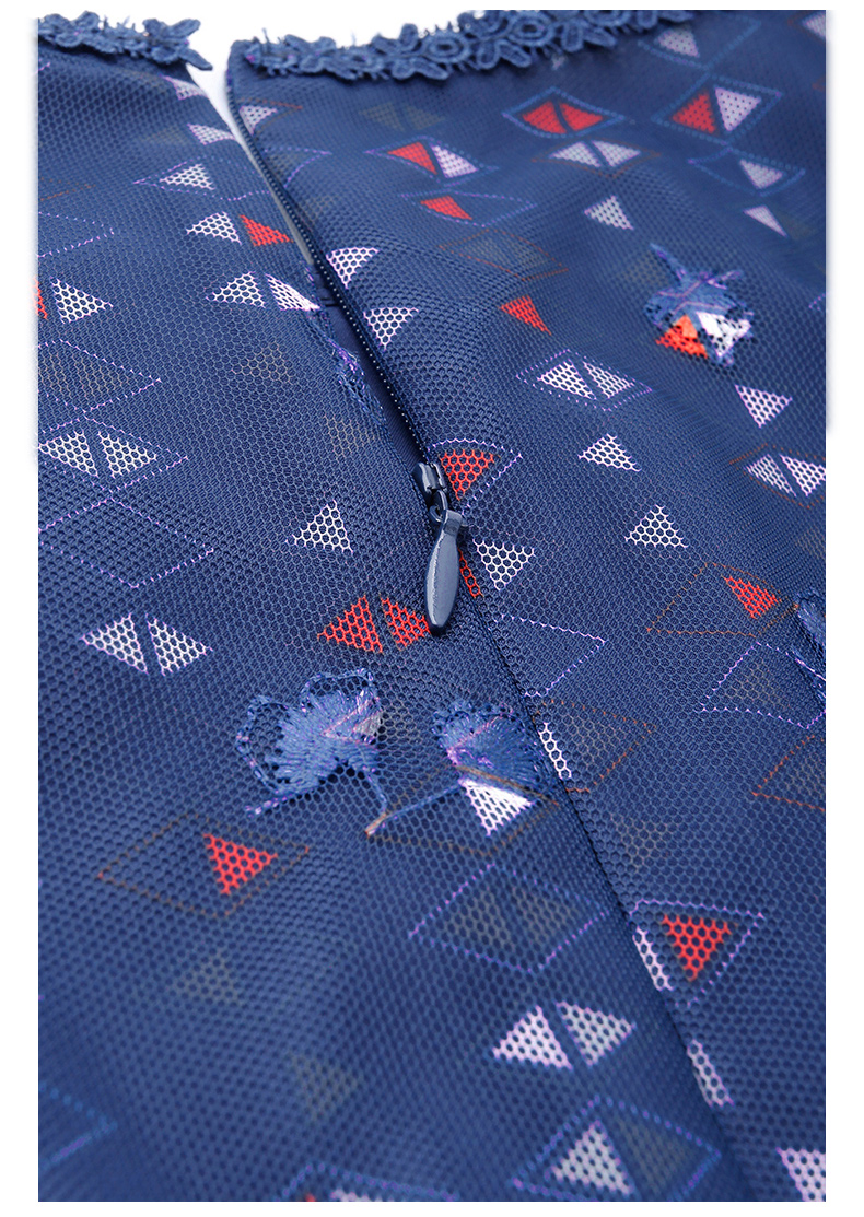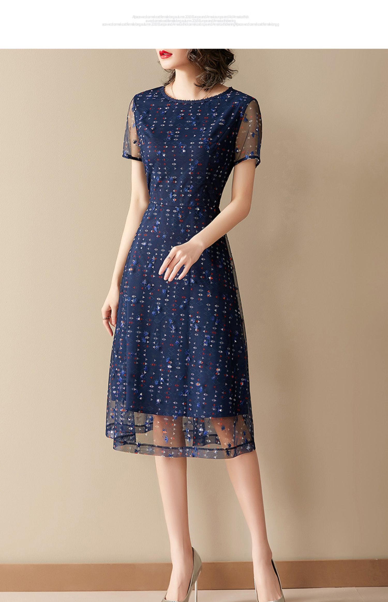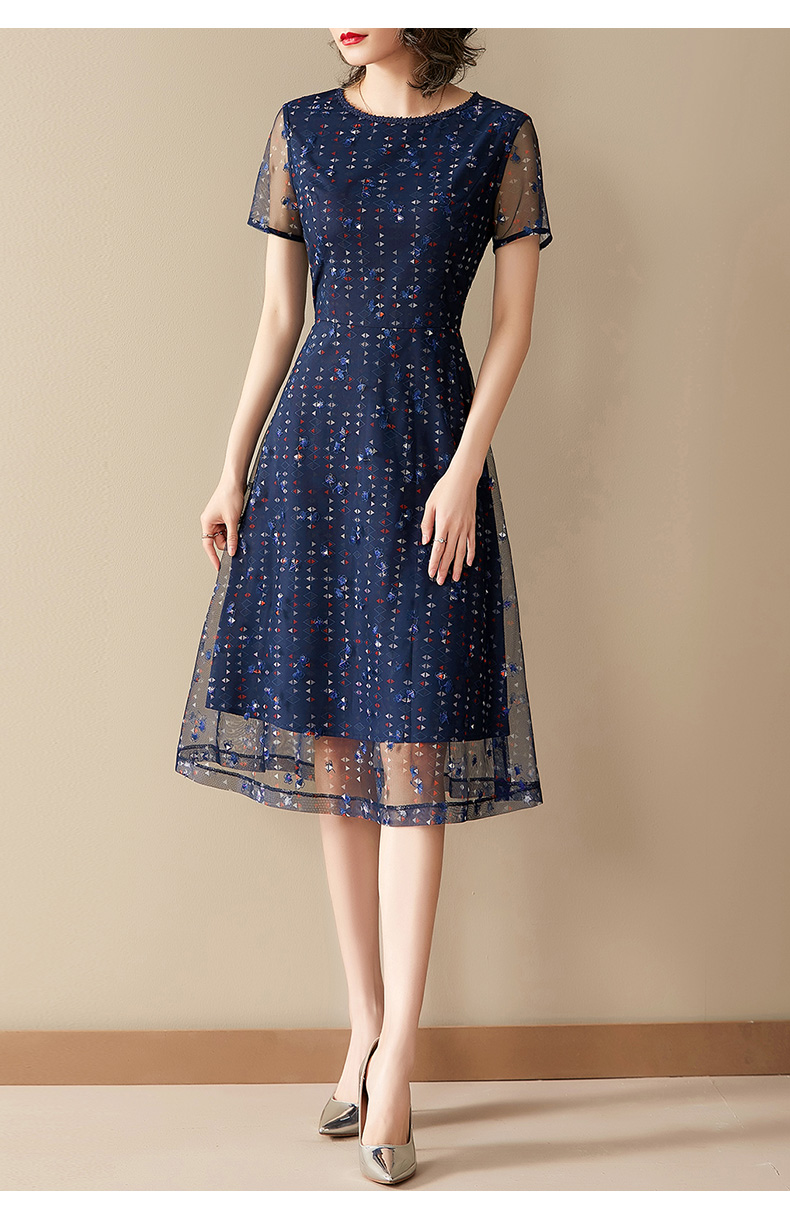 【1件7.9折】夏季新品時尚圓領網紗繡花裙子顯瘦短袖中長連衣裙