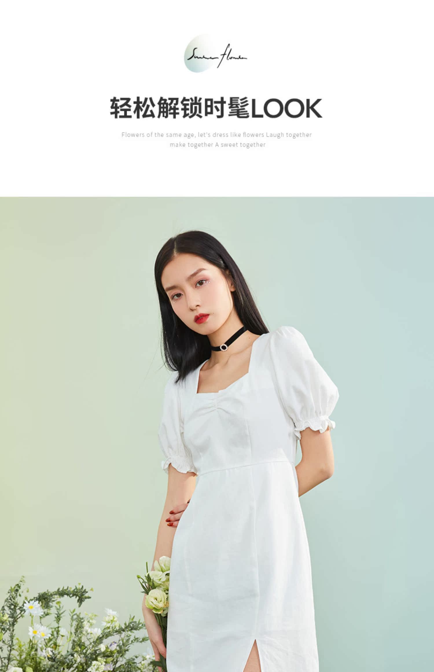 熱風女裝女士女神范優雅甜美氣質方領下擺開叉短袖連衣裙
