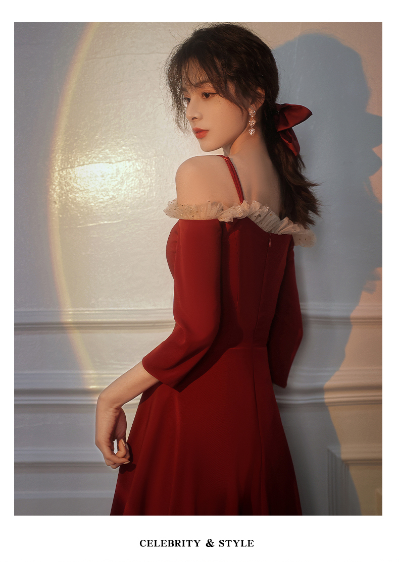 敬酒服新娘酒紅紗袖日常可穿輕訂婚禮服小個子法式裙子婚宴連衣裙