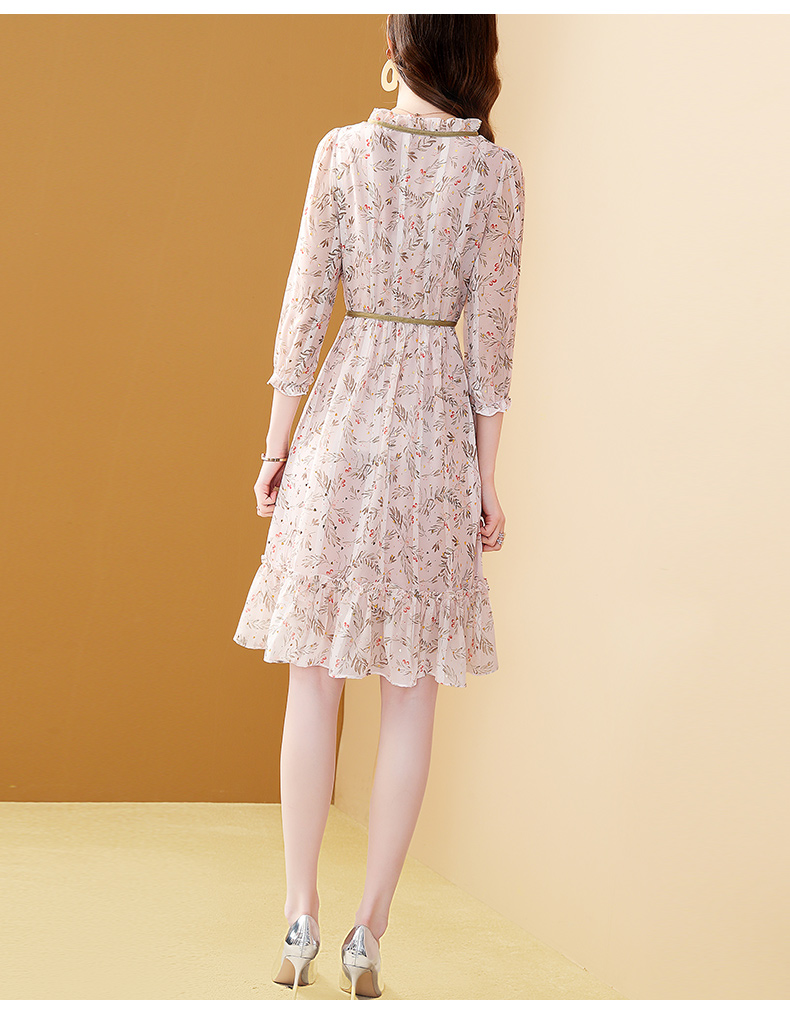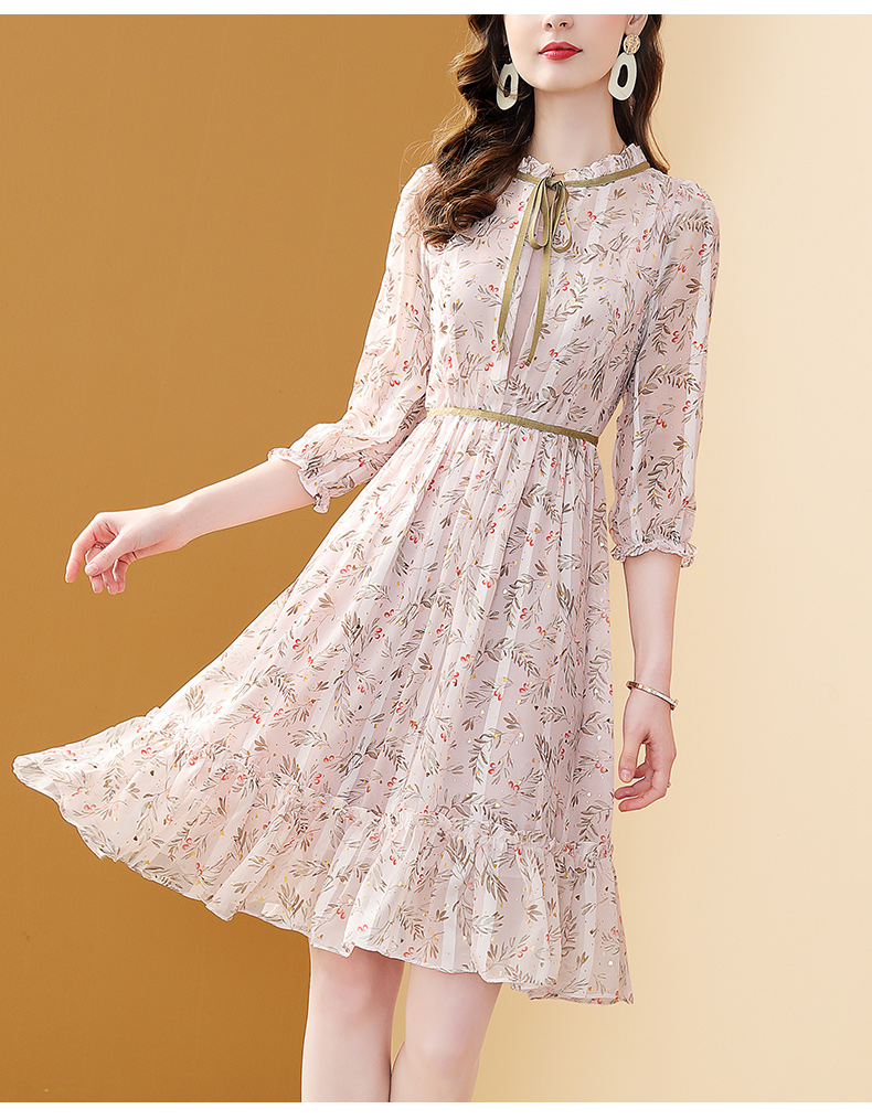 茗思法式雪紡連衣裙女2023早秋新款氣質木耳領修身顯瘦中長印花裙
