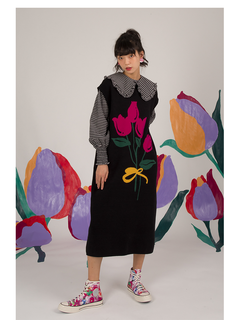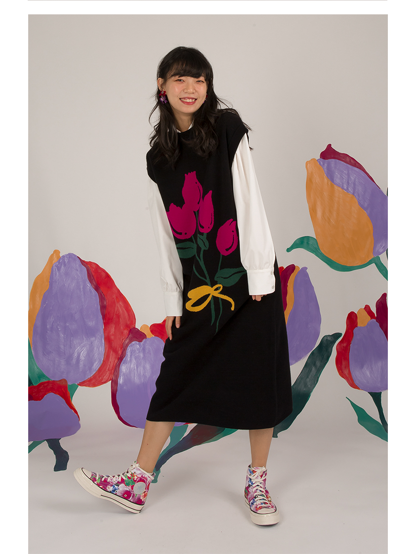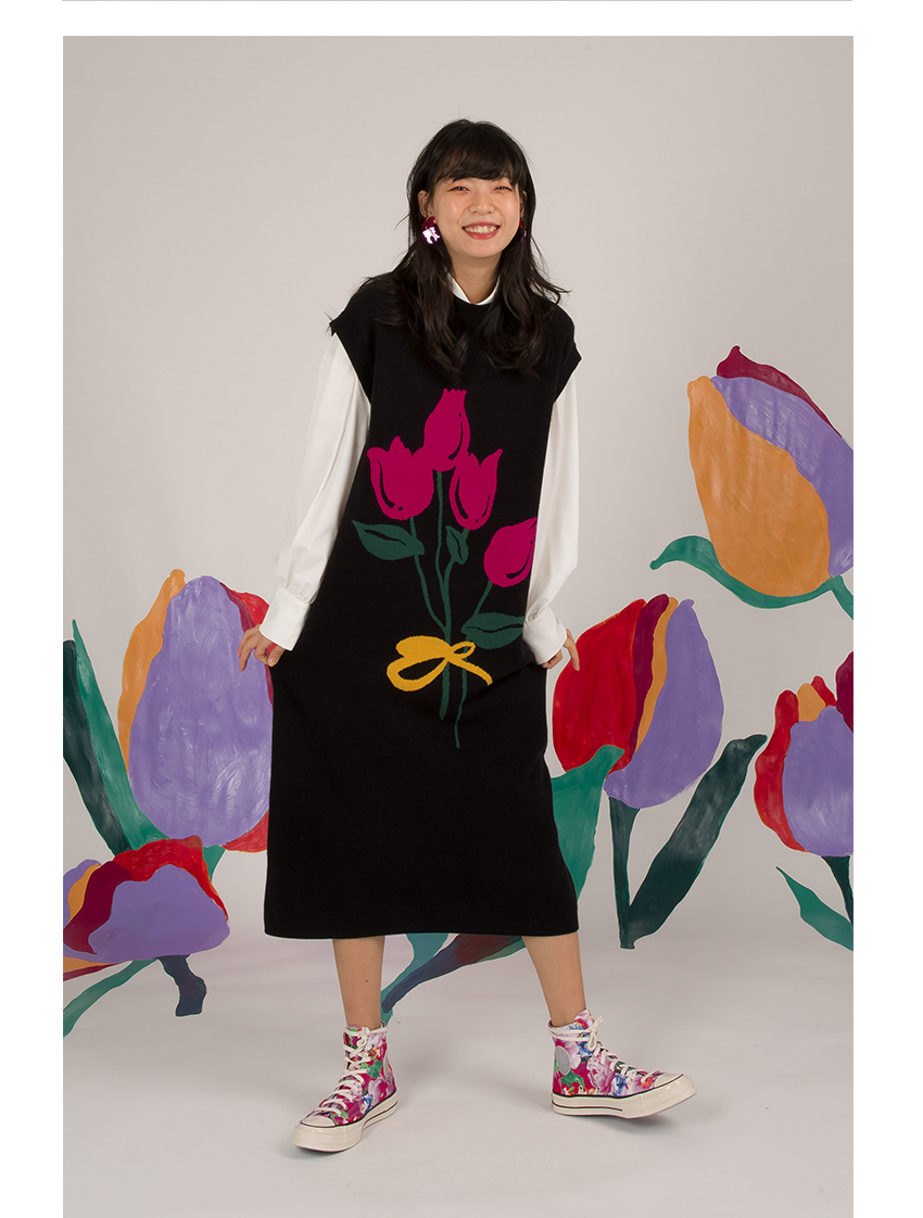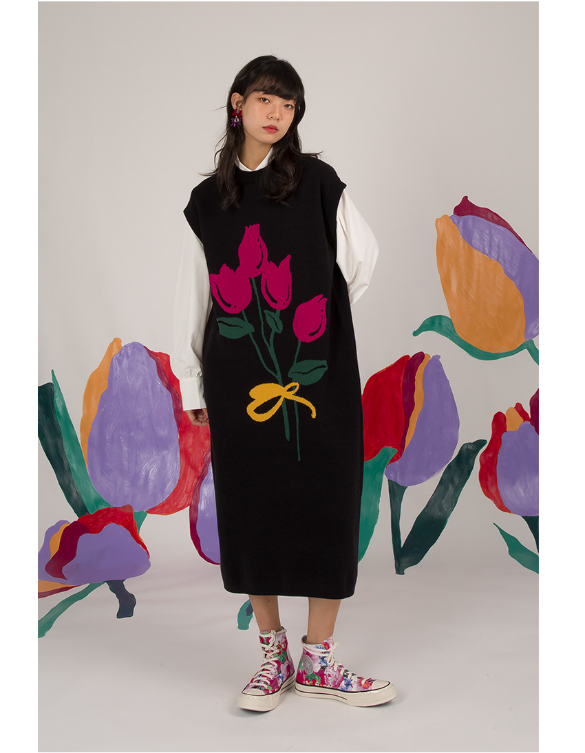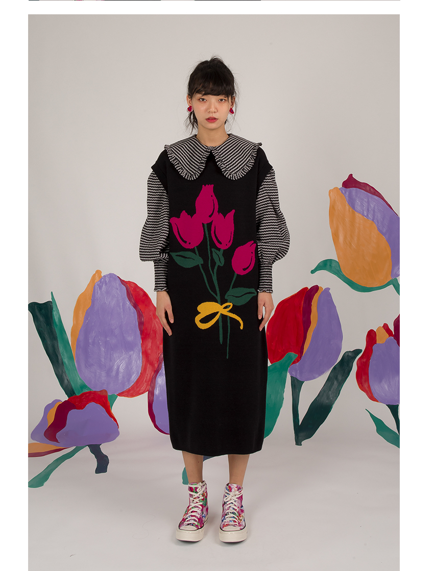 HHCH口海 日系復古少女手繪郁金香圖案馬甲背心針織無袖連衣裙