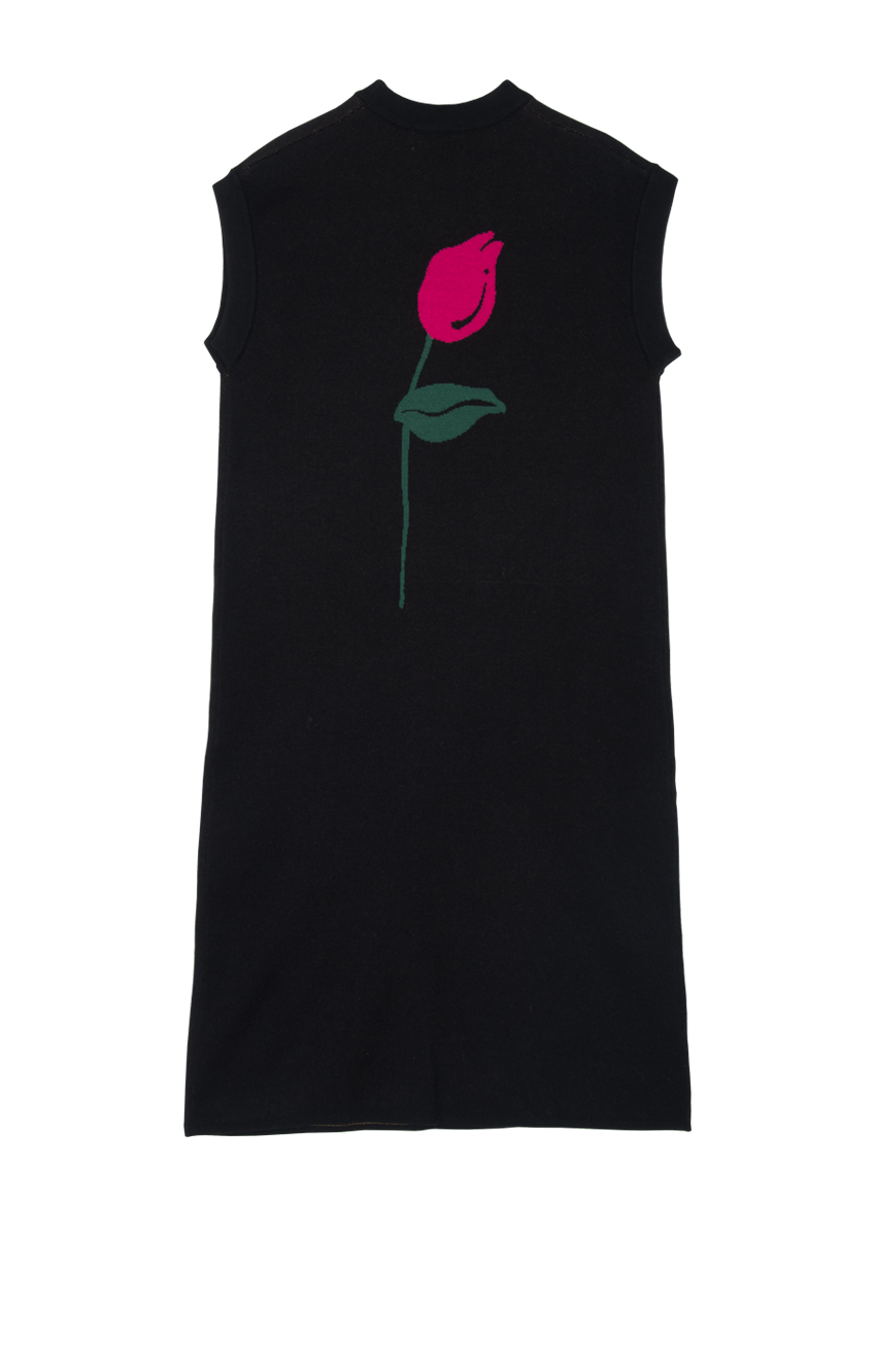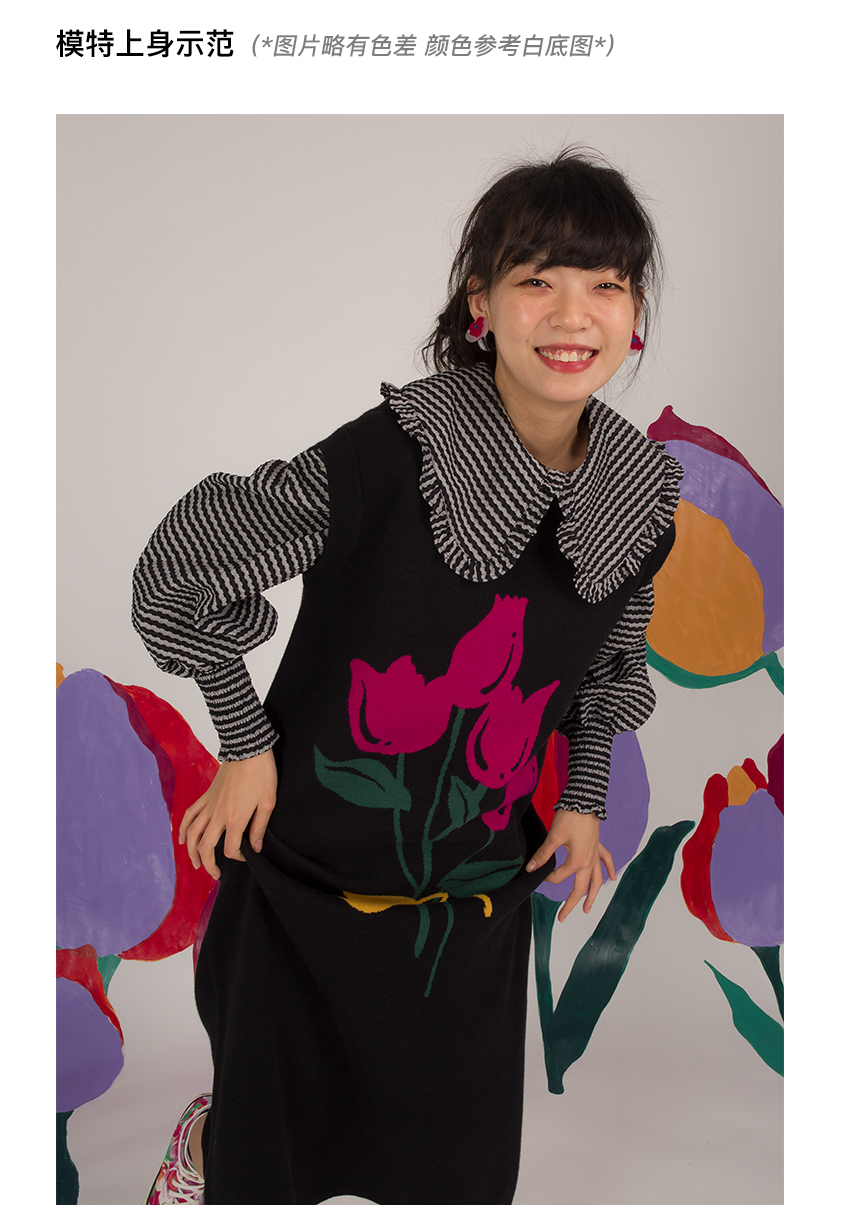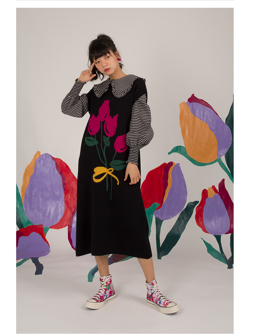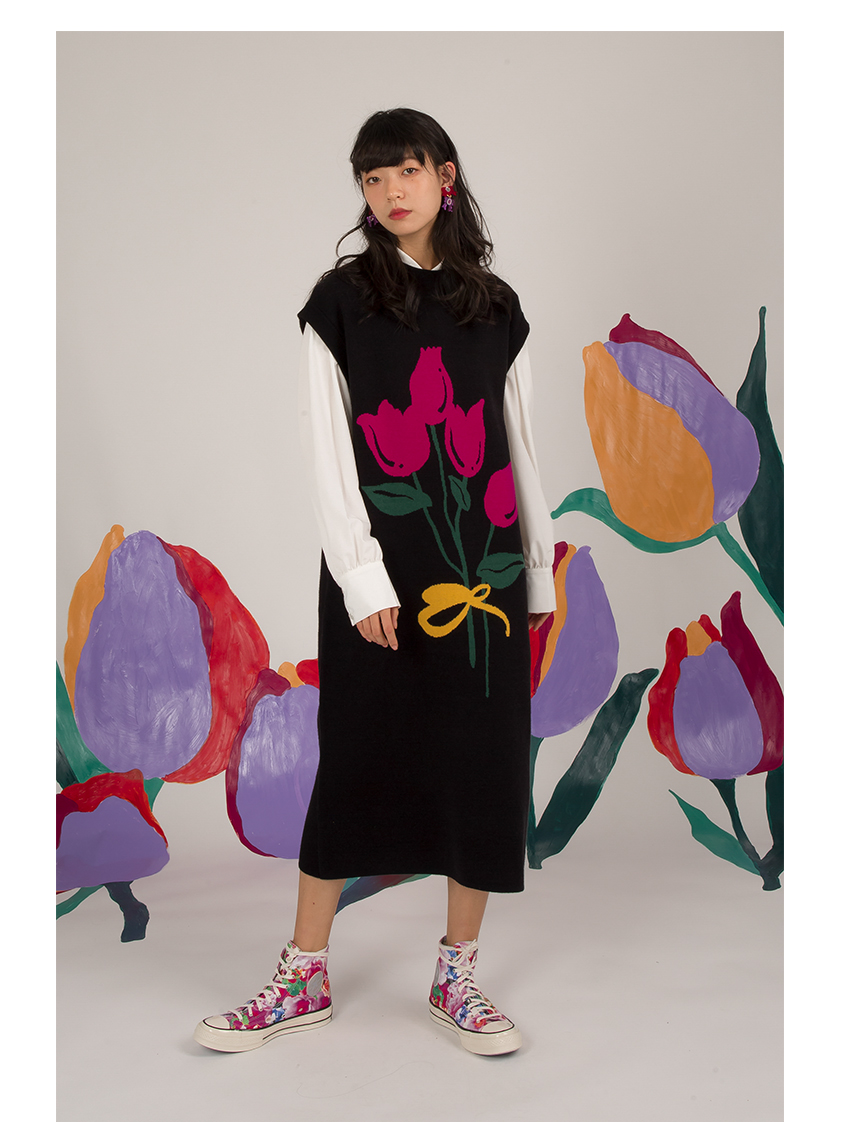 HHCH口海 日系復古少女手繪郁金香圖案馬甲背心針織無袖連衣裙
