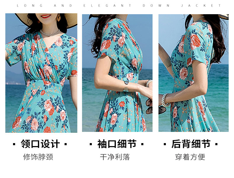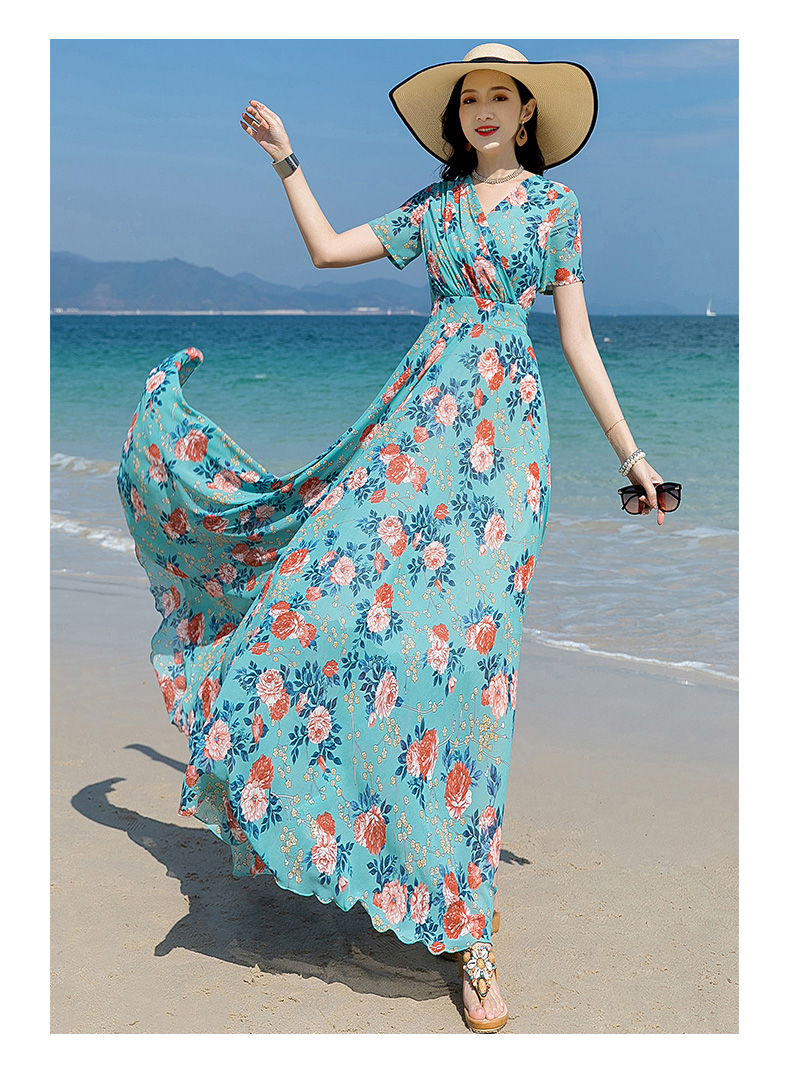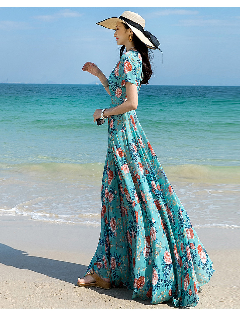 夏季雪紡碎花連衣裙女長款到腳踝洋氣高端顯瘦氣質超長V領長裙子