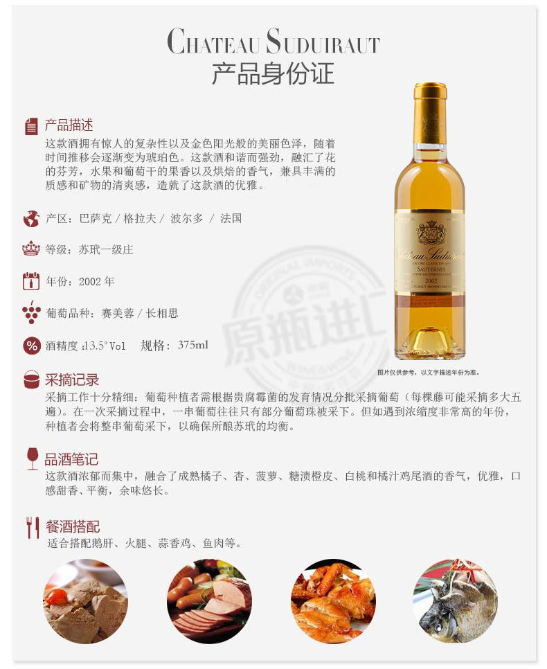 中糧進口 法國蘇玳產區旭金堡貴腐甜白葡萄酒2002 375ml整箱6支