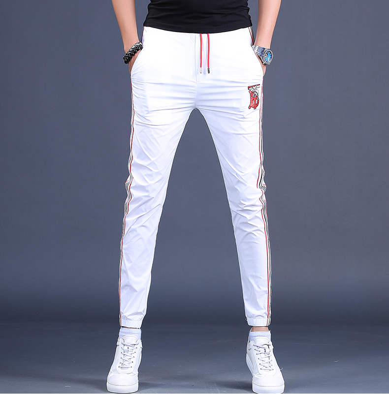 潮牌刺繡白色休閑褲男修身束腳運動褲夏季新款衛褲收口小腳褲子男