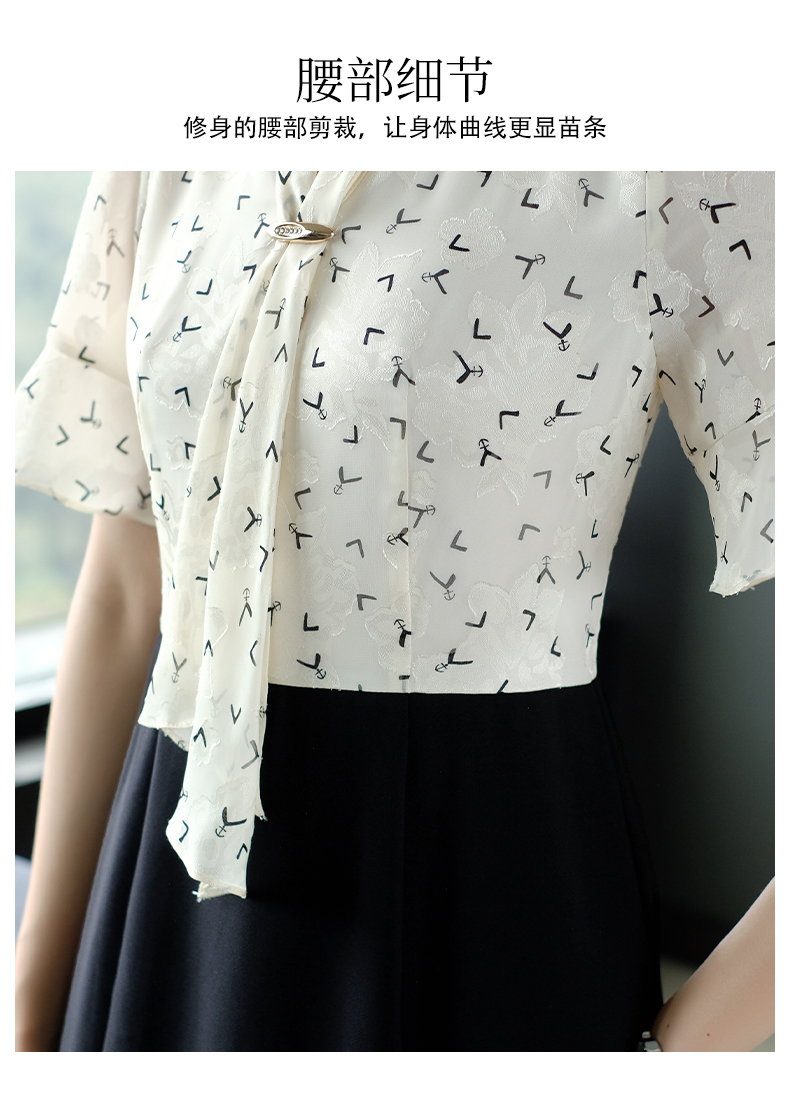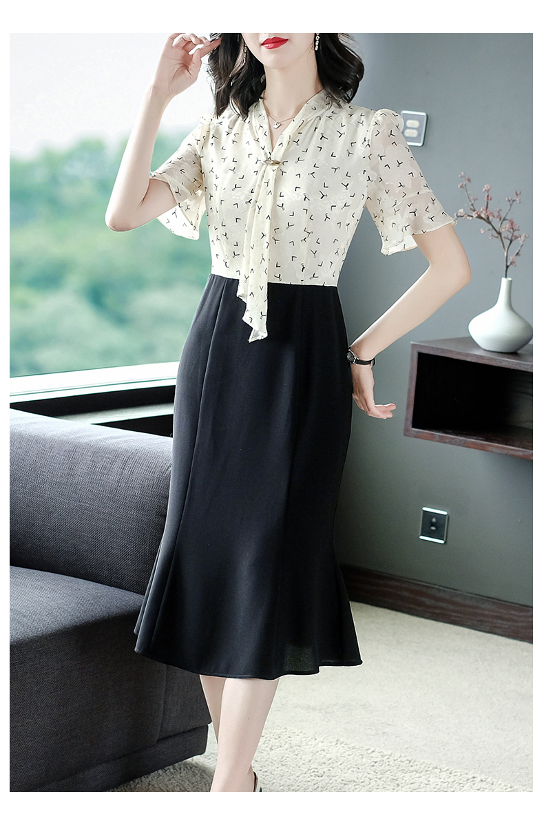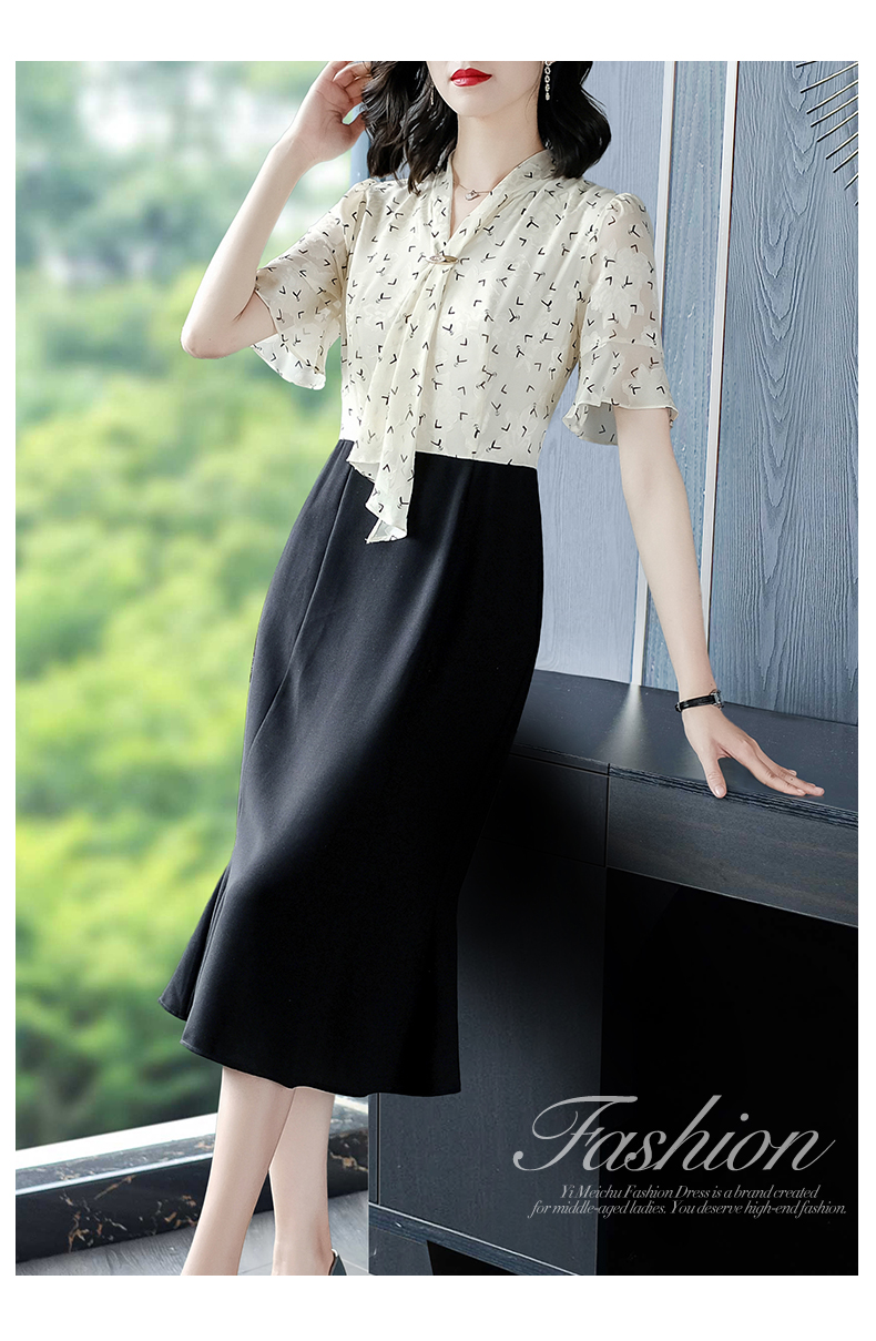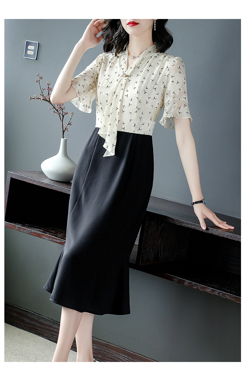 高端輕奢連衣裙夏裝小香風女人味成熟氣質印花飄帶洋氣黑色魚尾裙