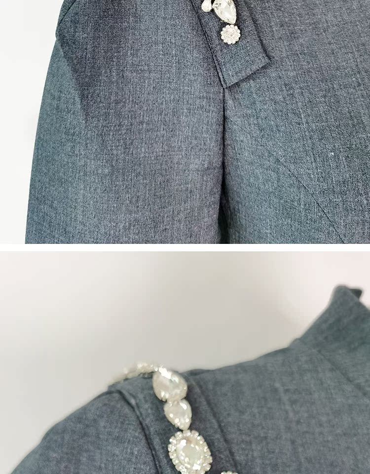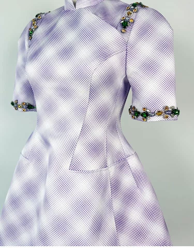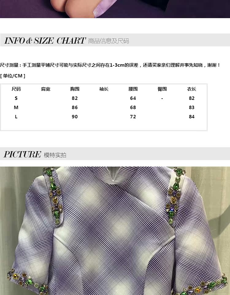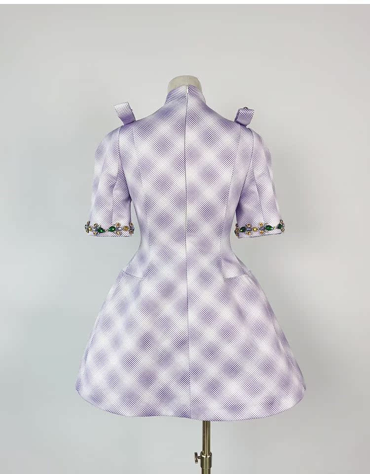 設計師春夏新款氣質重工鑲鉆格子高腰裙子紫色改良旗袍連衣裙女
