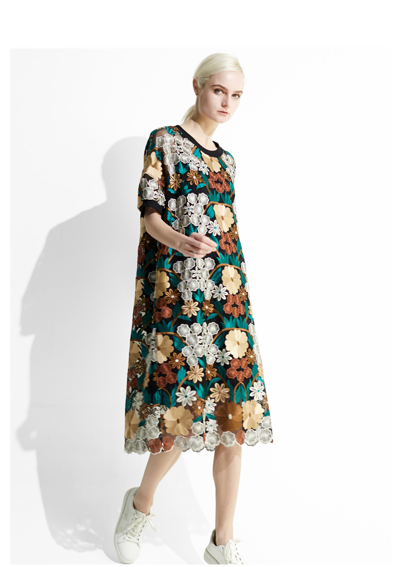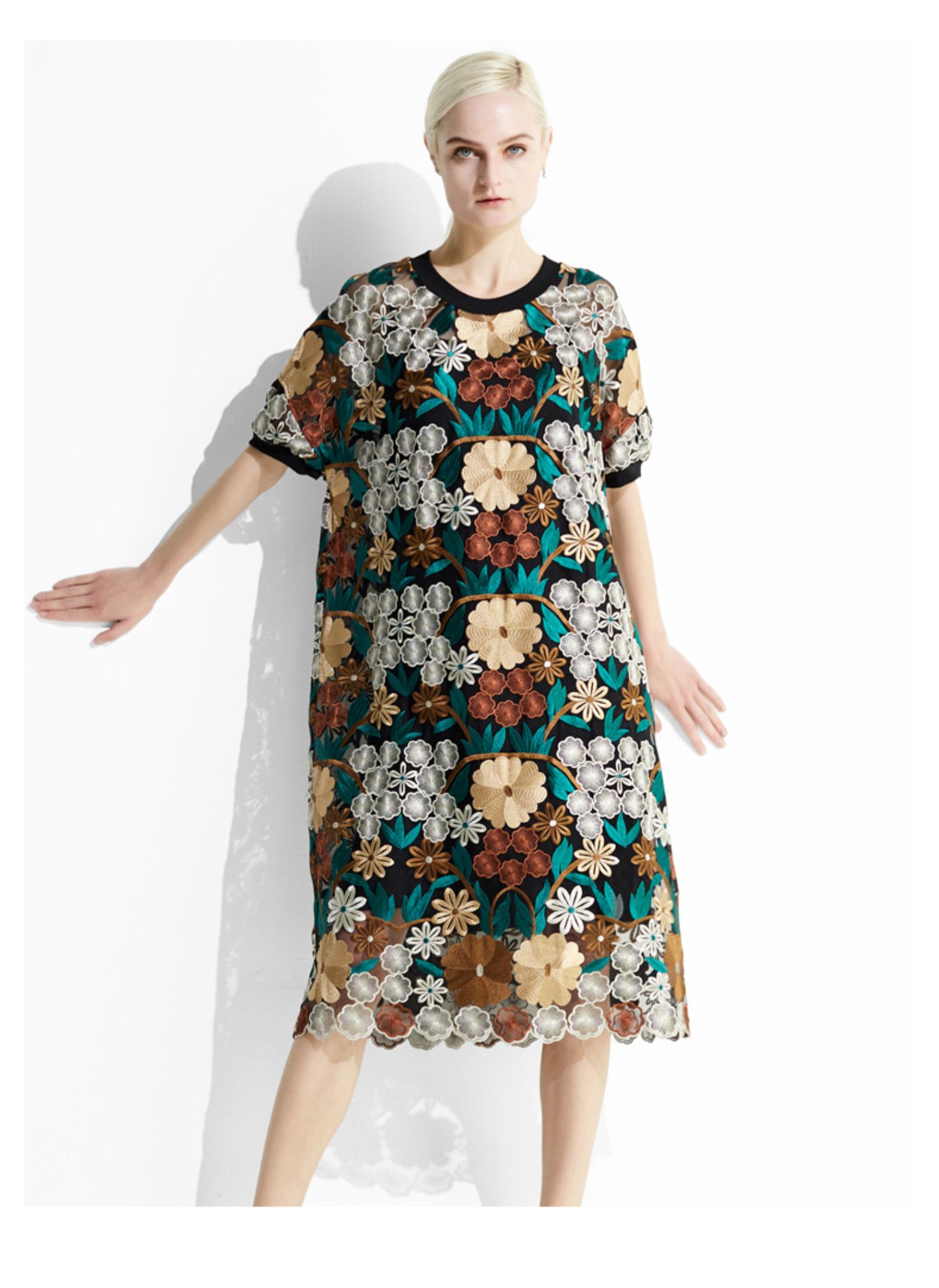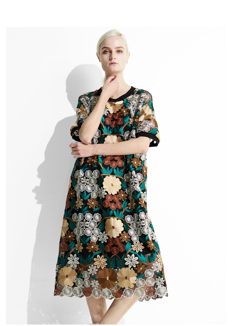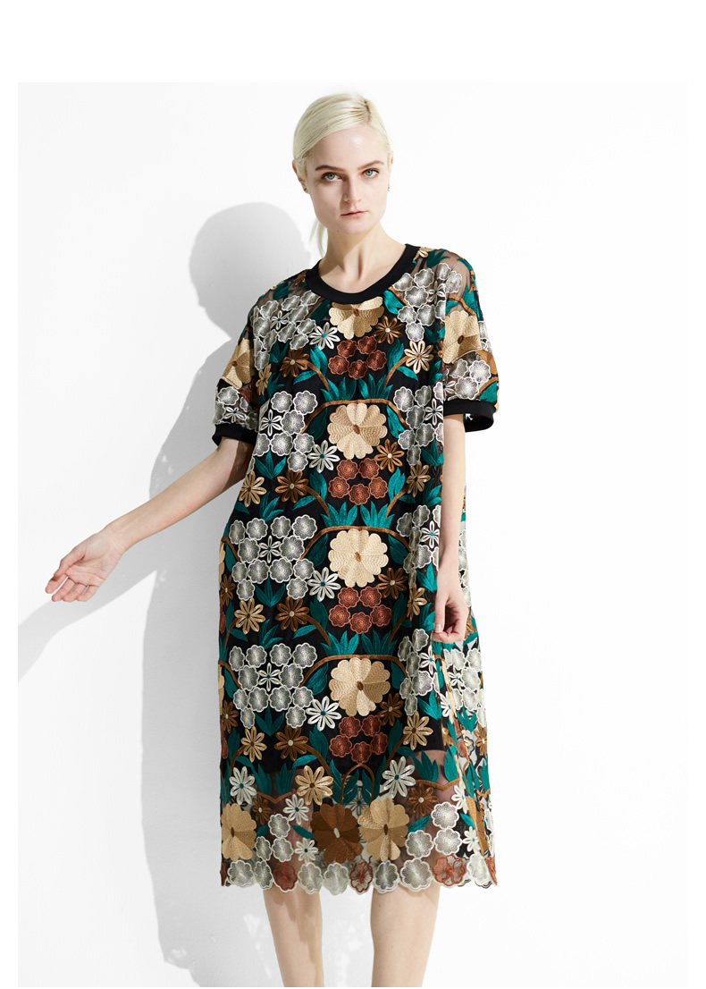 YUESPACE重工蕾絲繡花連衣裙夏裝裙子寬松顯瘦短袖圓領復古a字裙