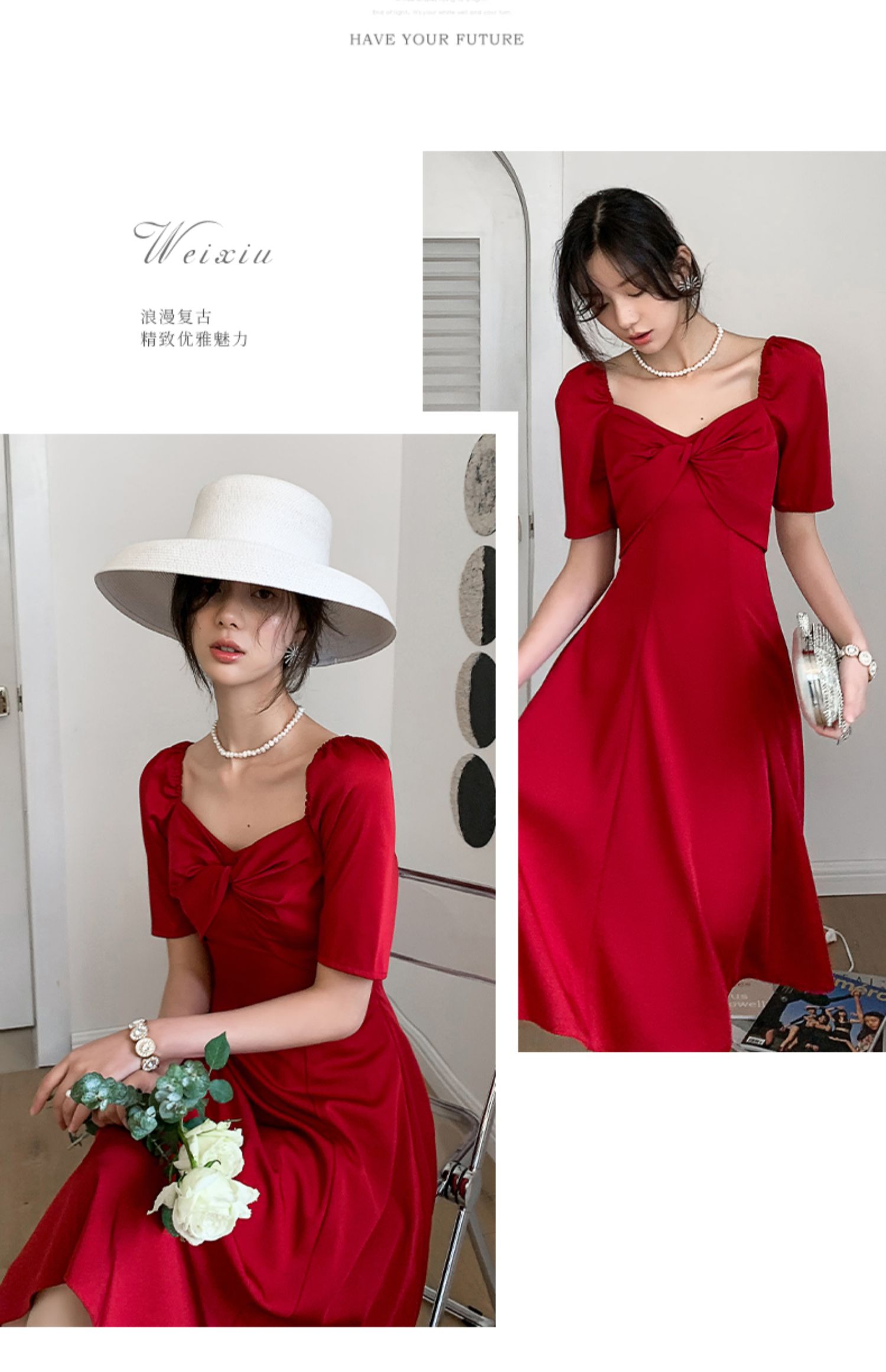 新娘酒紅色夏季婚禮法式方領敬酒服