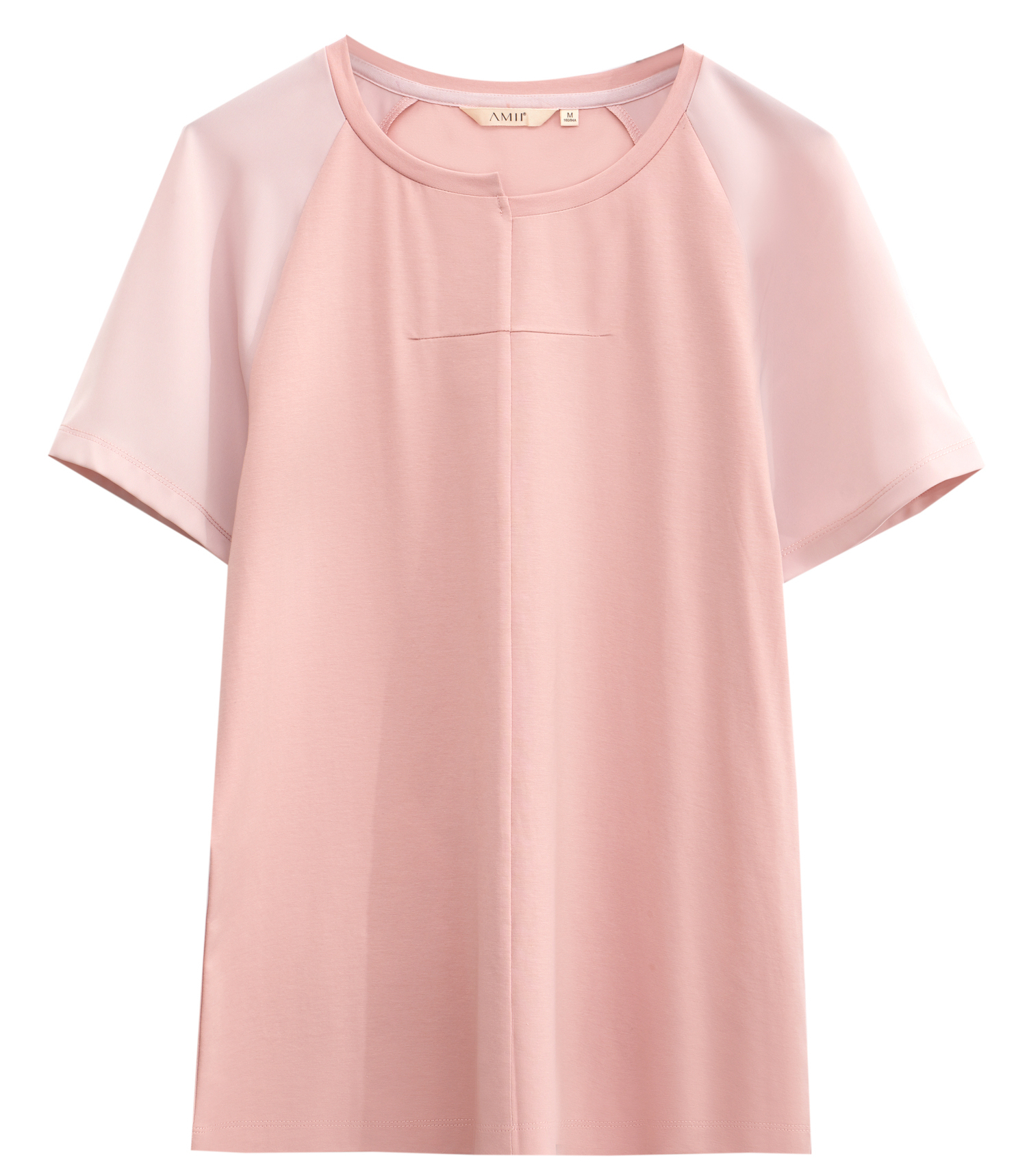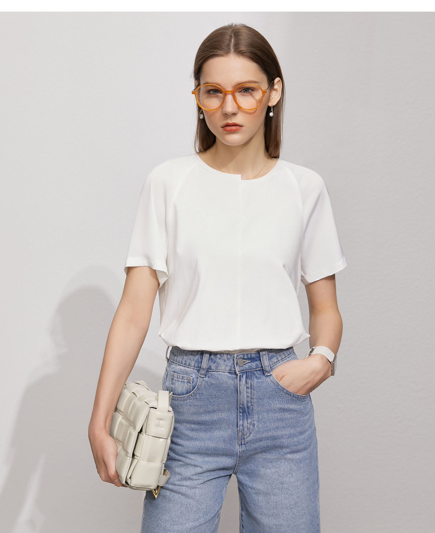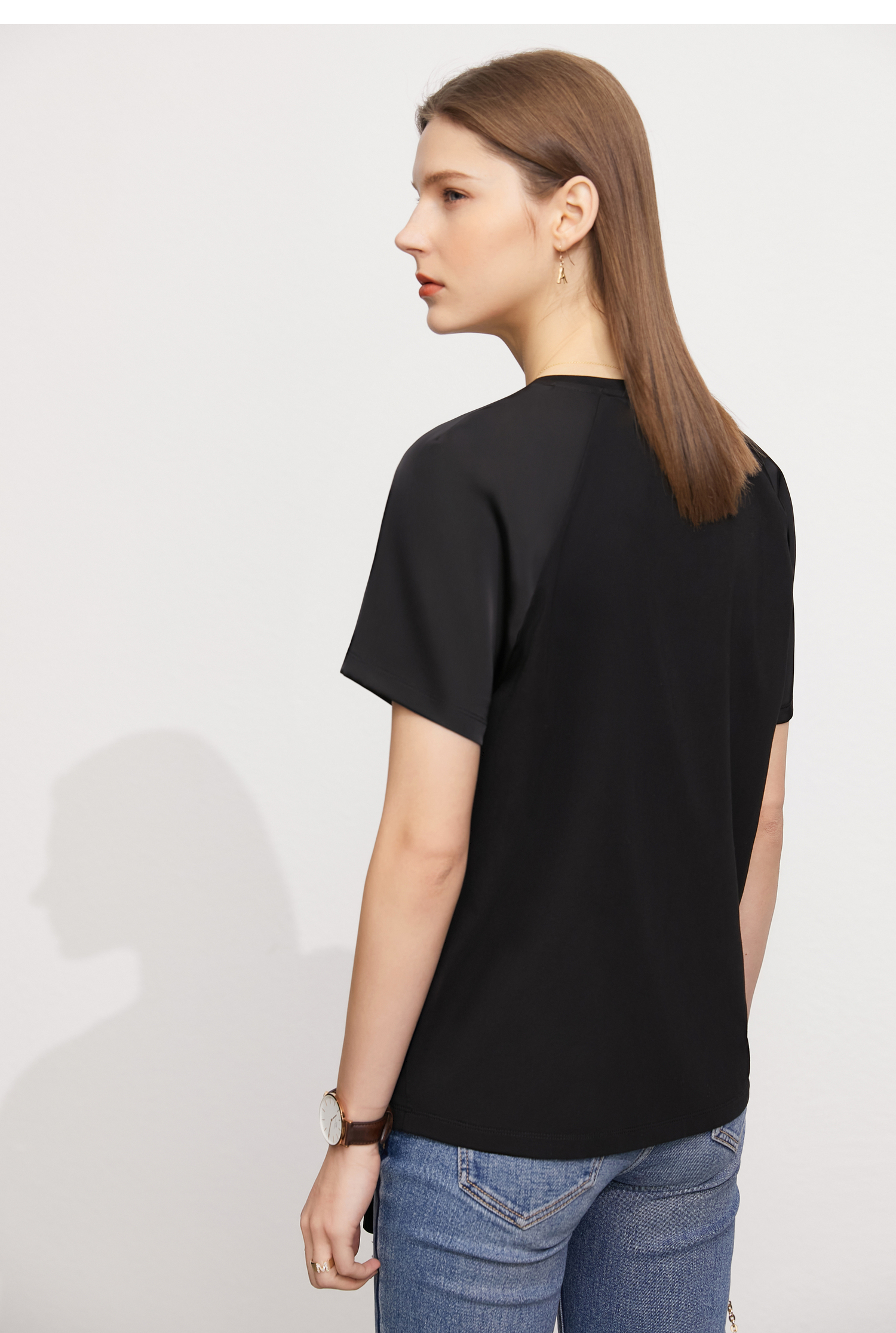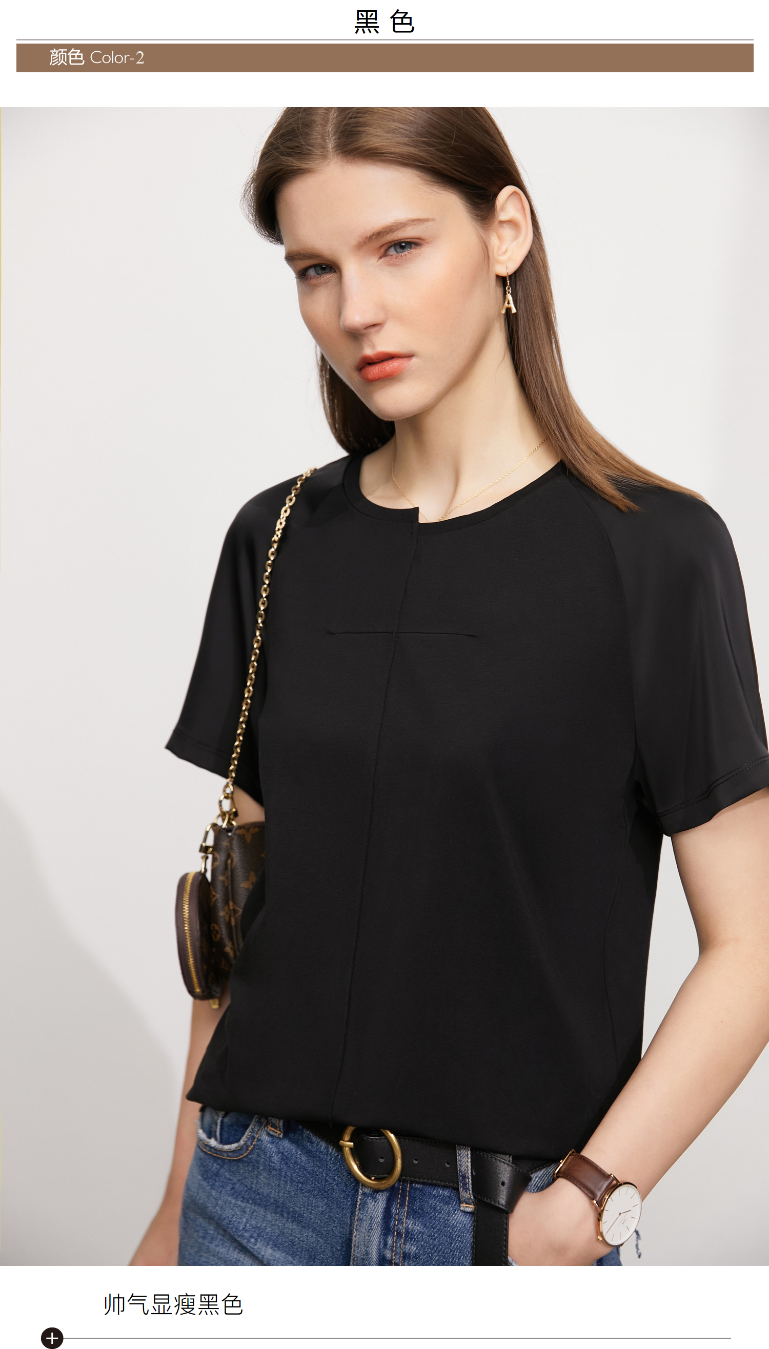Amii極簡撞料拼接緞面插肩袖棉質T恤女2023夏季新款寬松短袖上衣