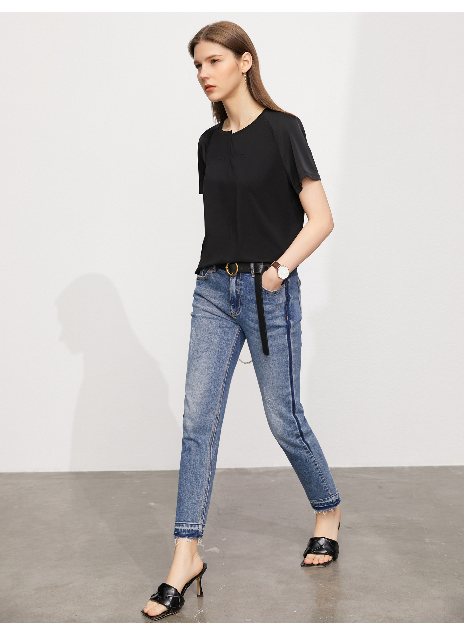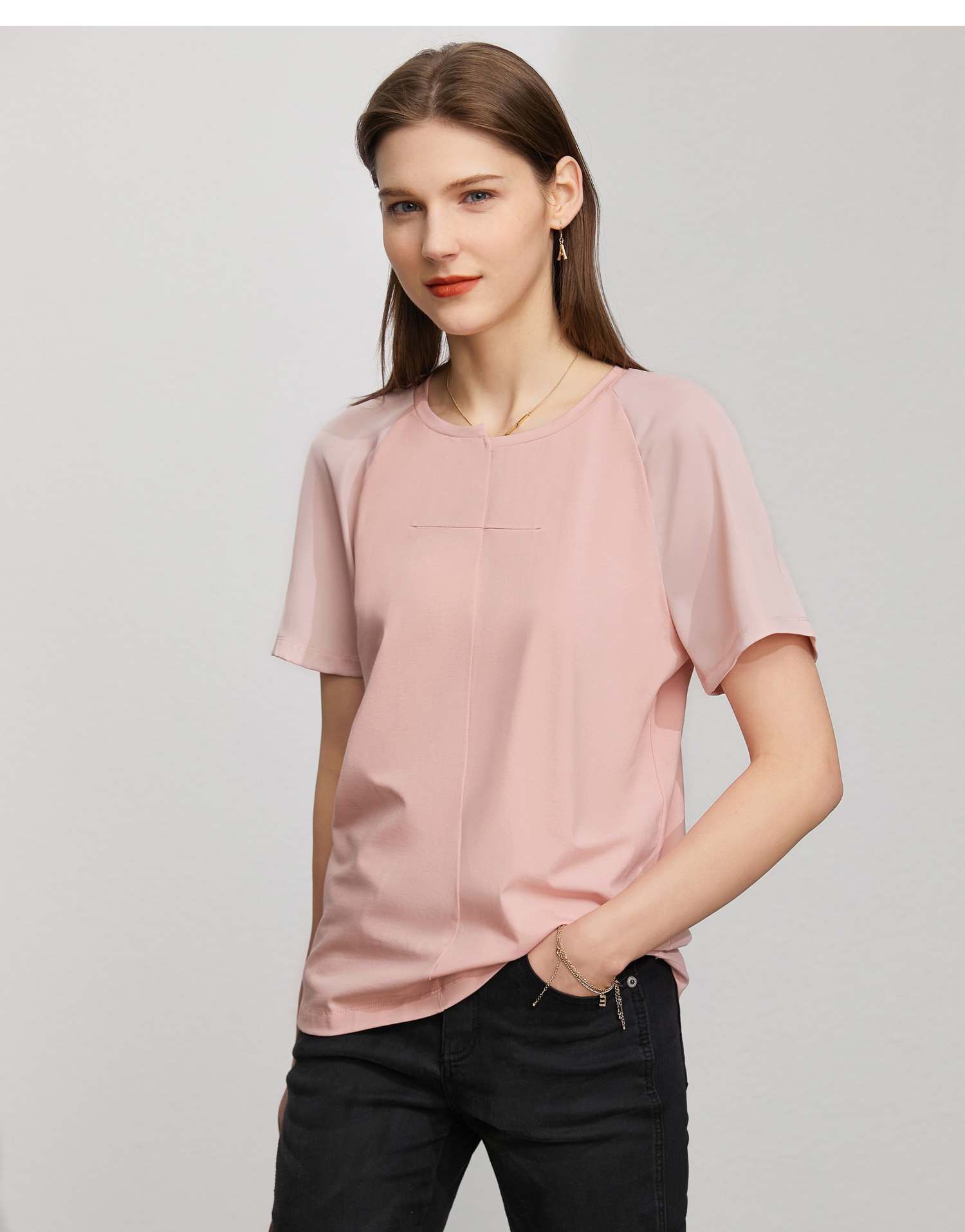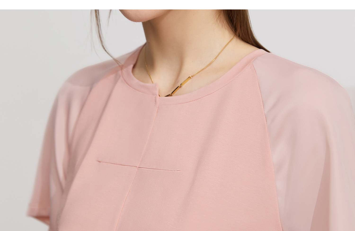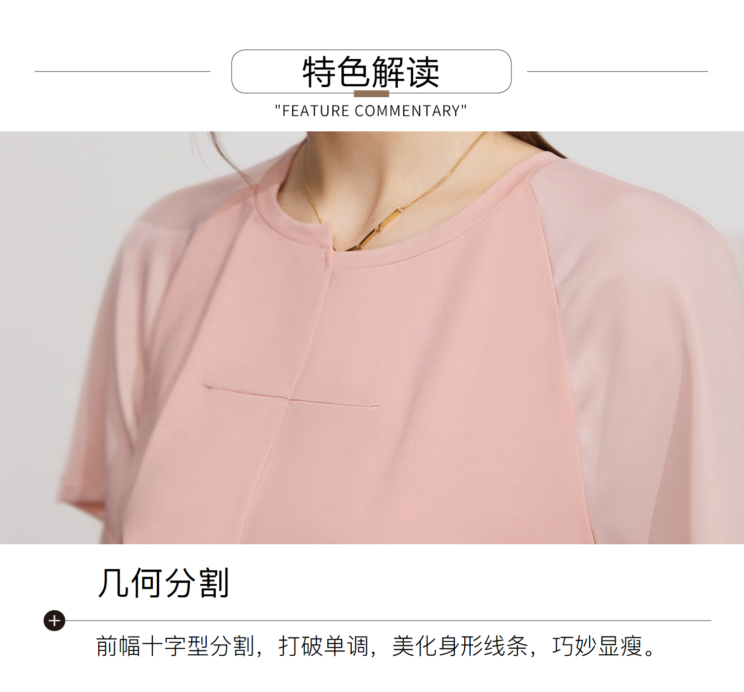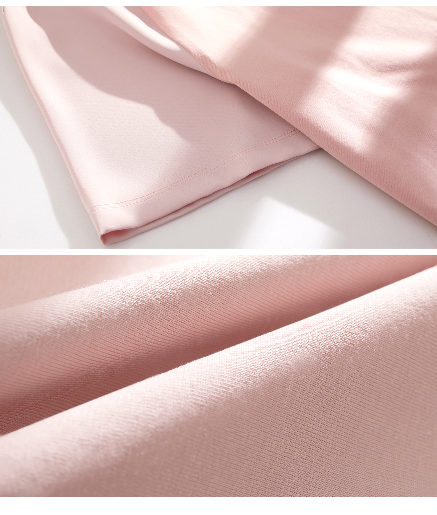 Amii極簡撞料拼接緞面插肩袖棉質T恤女2023夏季新款寬松短袖上衣
