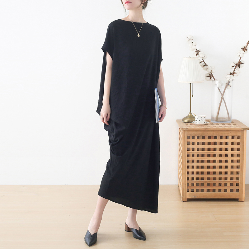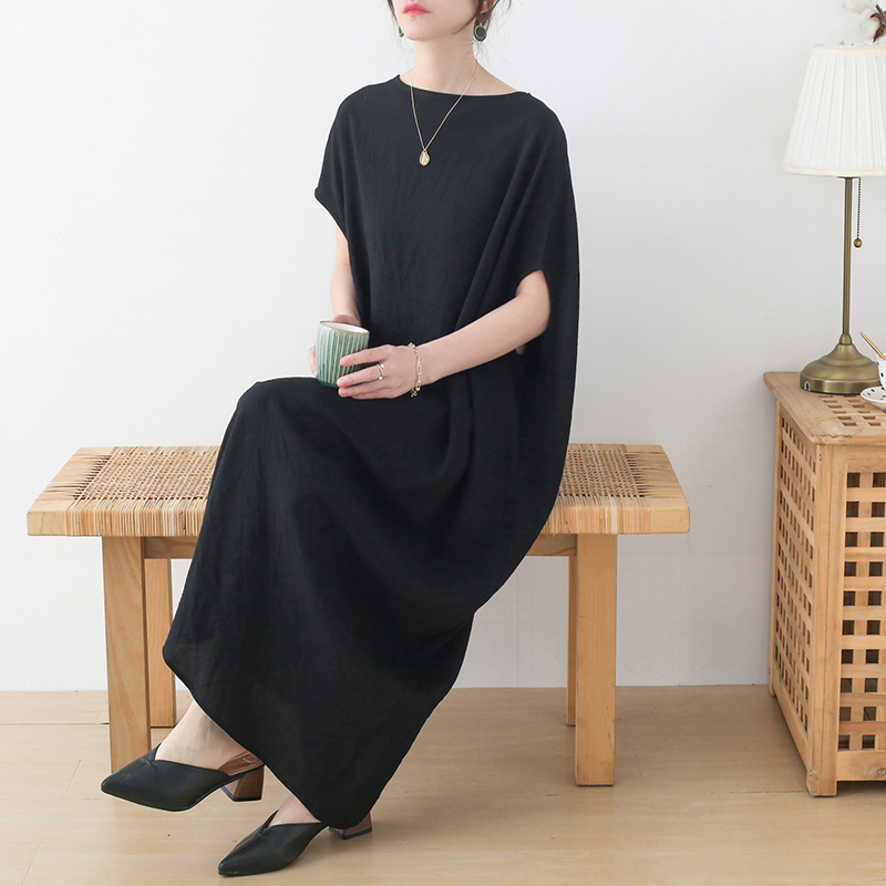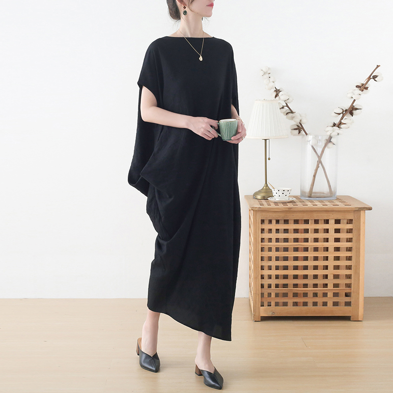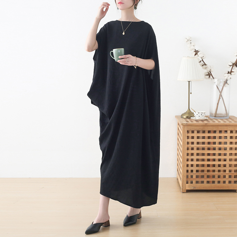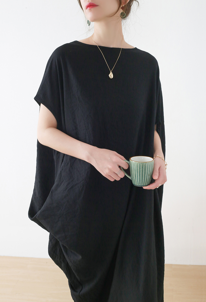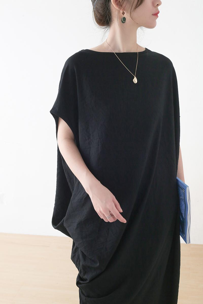 兮原創風設計師風格純色不規則連衣裙大碼寬松蝙蝠袖中長裙23夏款