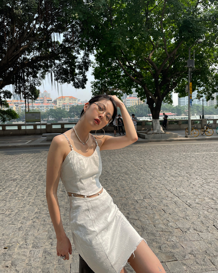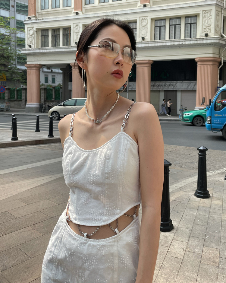 EhK 奶酪甜心 白色愛心可拆卸兩穿鏈條牛仔 出游連衣裙2023新款夏