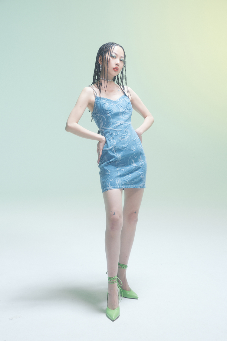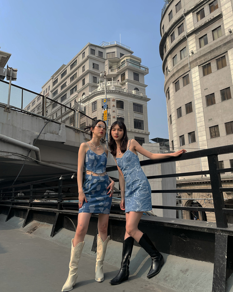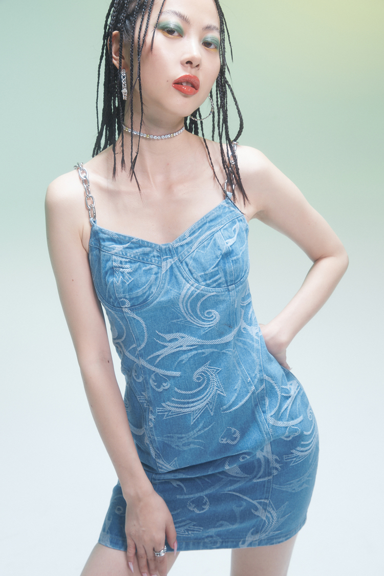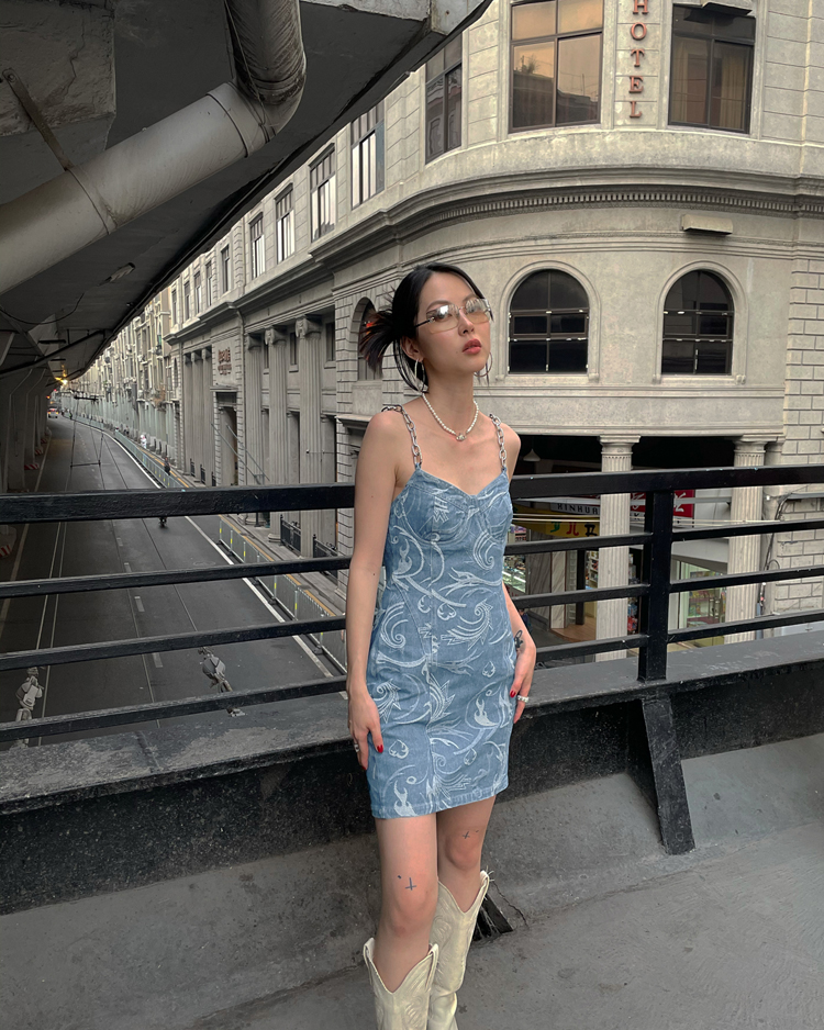 EhK原創設計感高腰藍色提花牛仔鏈條吊帶秋季新款連衣裙女