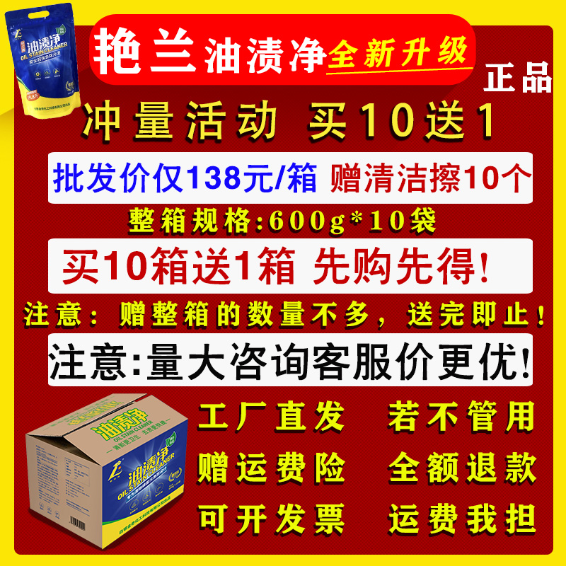 油漬凈強力去污艷蘭牌廚房油煙機清潔劑衣物去漬凈整箱600g*10袋