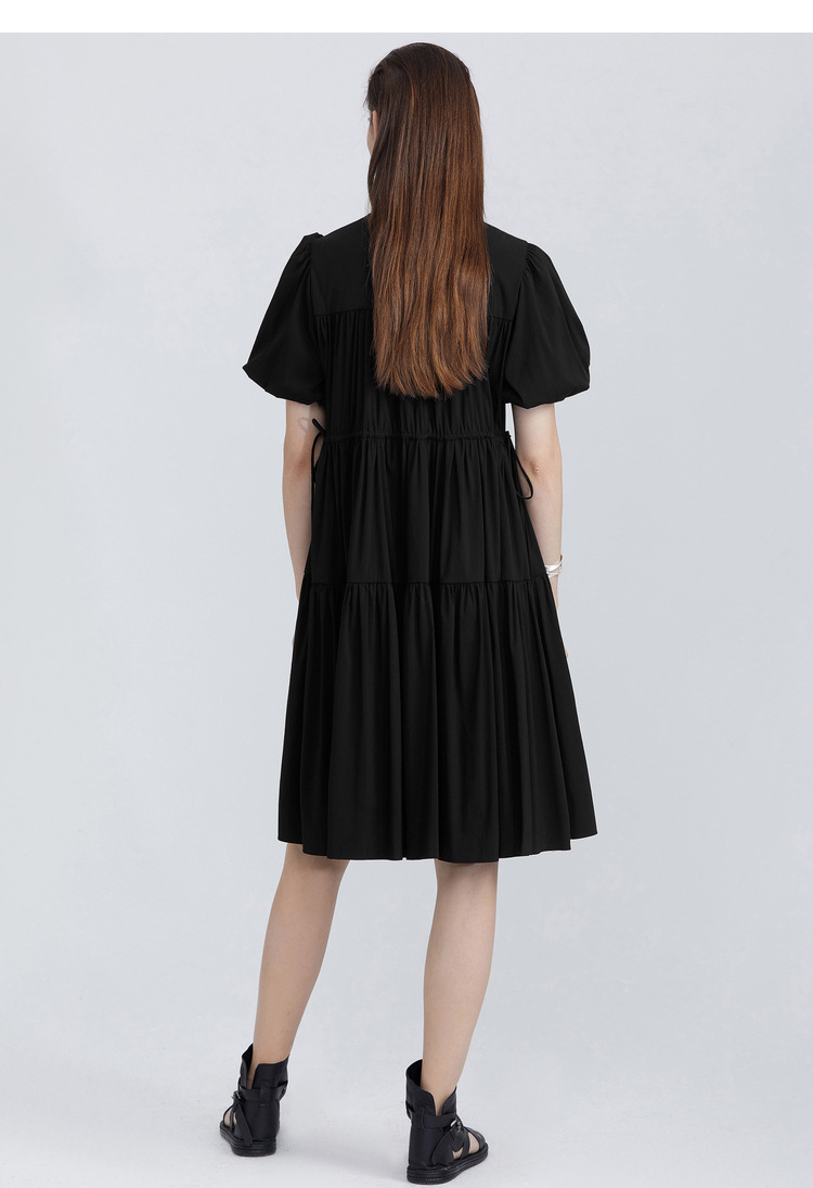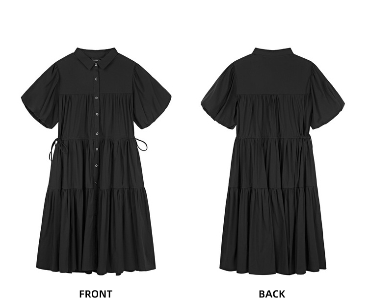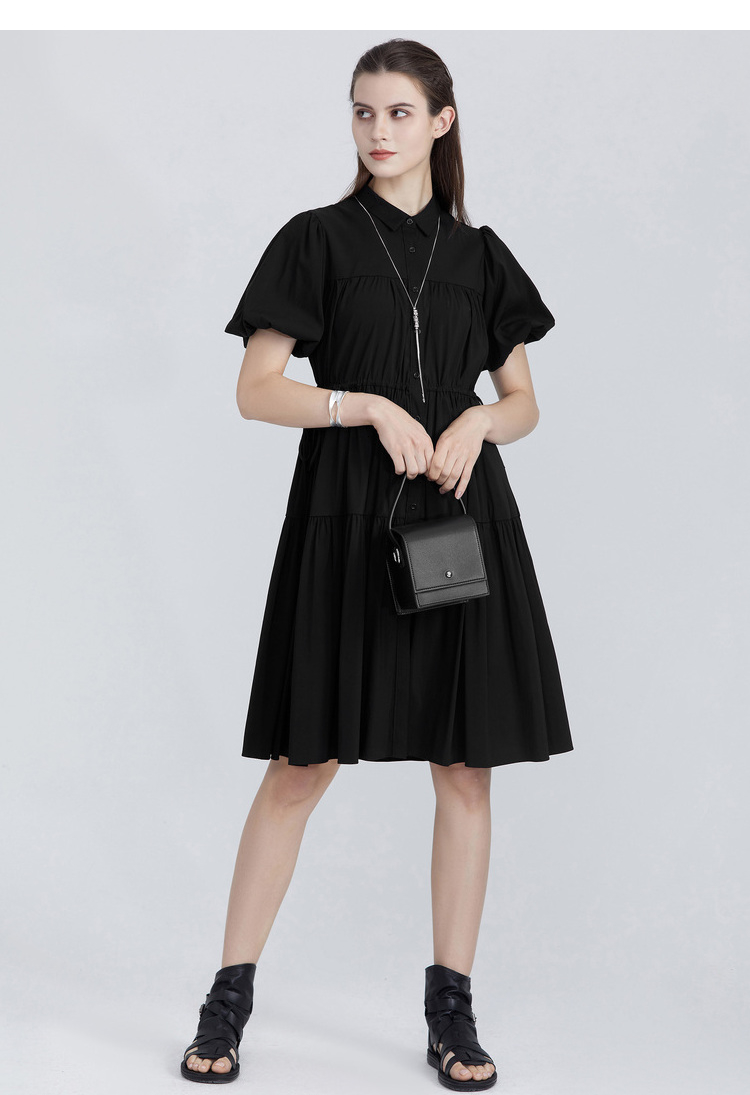 sdeer圣迪奧夏裝休閑翻領收腰少女泡泡袖小黑裙連衣裙女S21281206