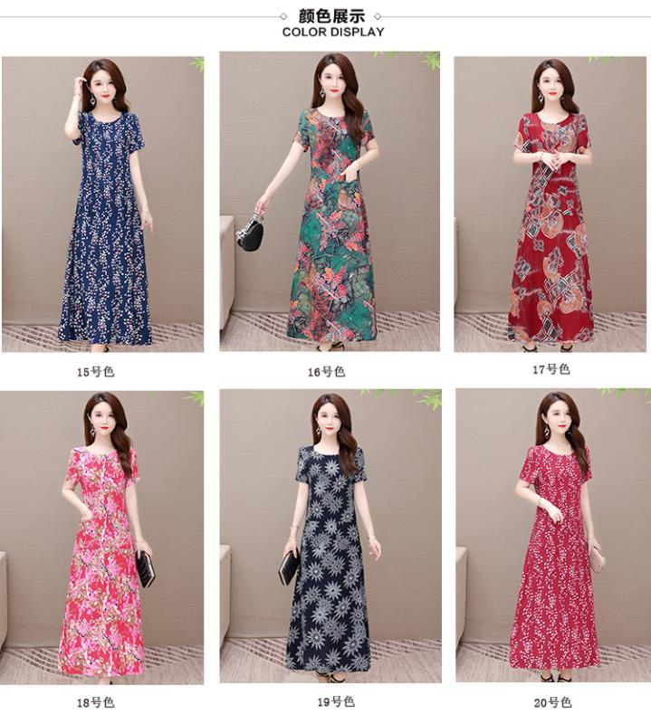 新款氣質棉綢連衣裙女士夏季中年媽媽夏裝過膝收腰短袖碎花中長裙