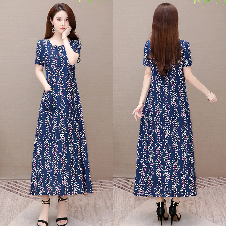 氣質人造棉連衣裙2023新款過膝棉綢夏裝薄時尚媽媽中長款碎花裙子