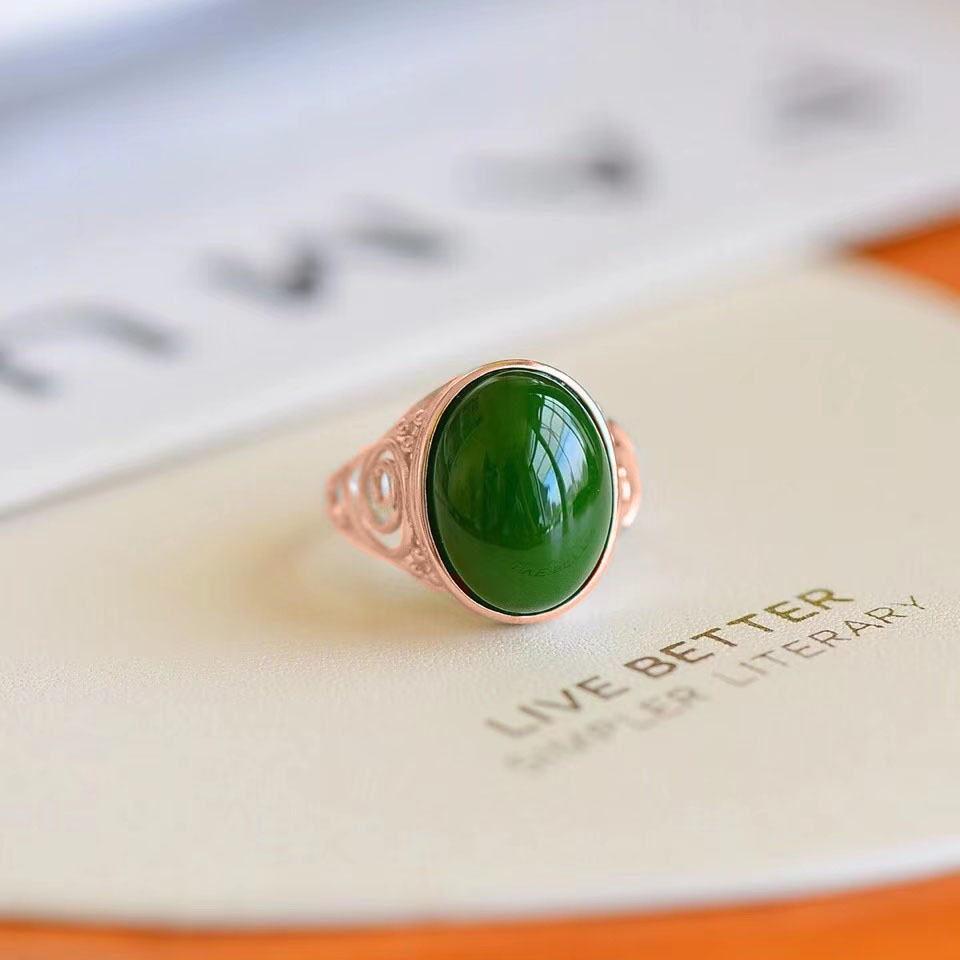 天然和田玉蛋面S925純銀玫瑰金戒指復古如意開口民族風簡約飾品女