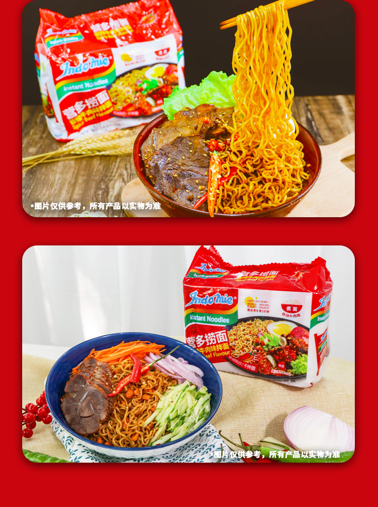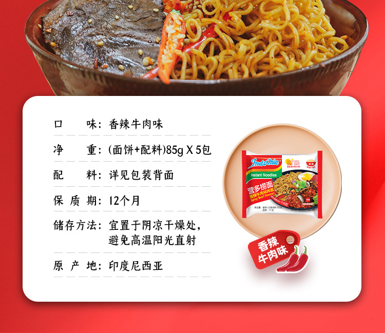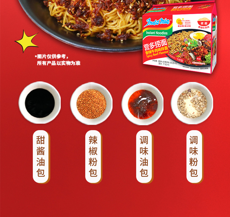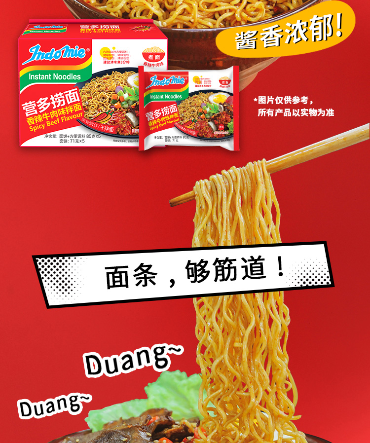 印尼進口Indomie/營多撈面香辣牛肉味85g*5袋泡面速食早餐方便面