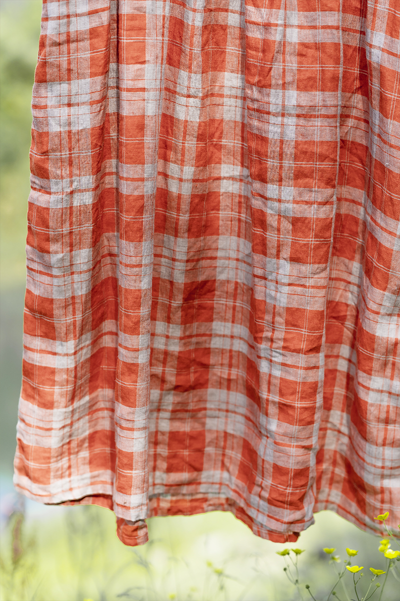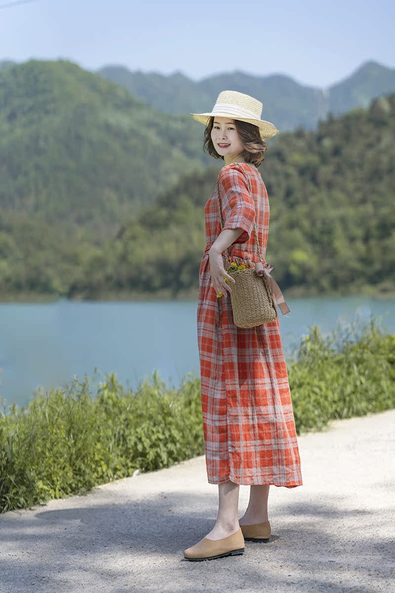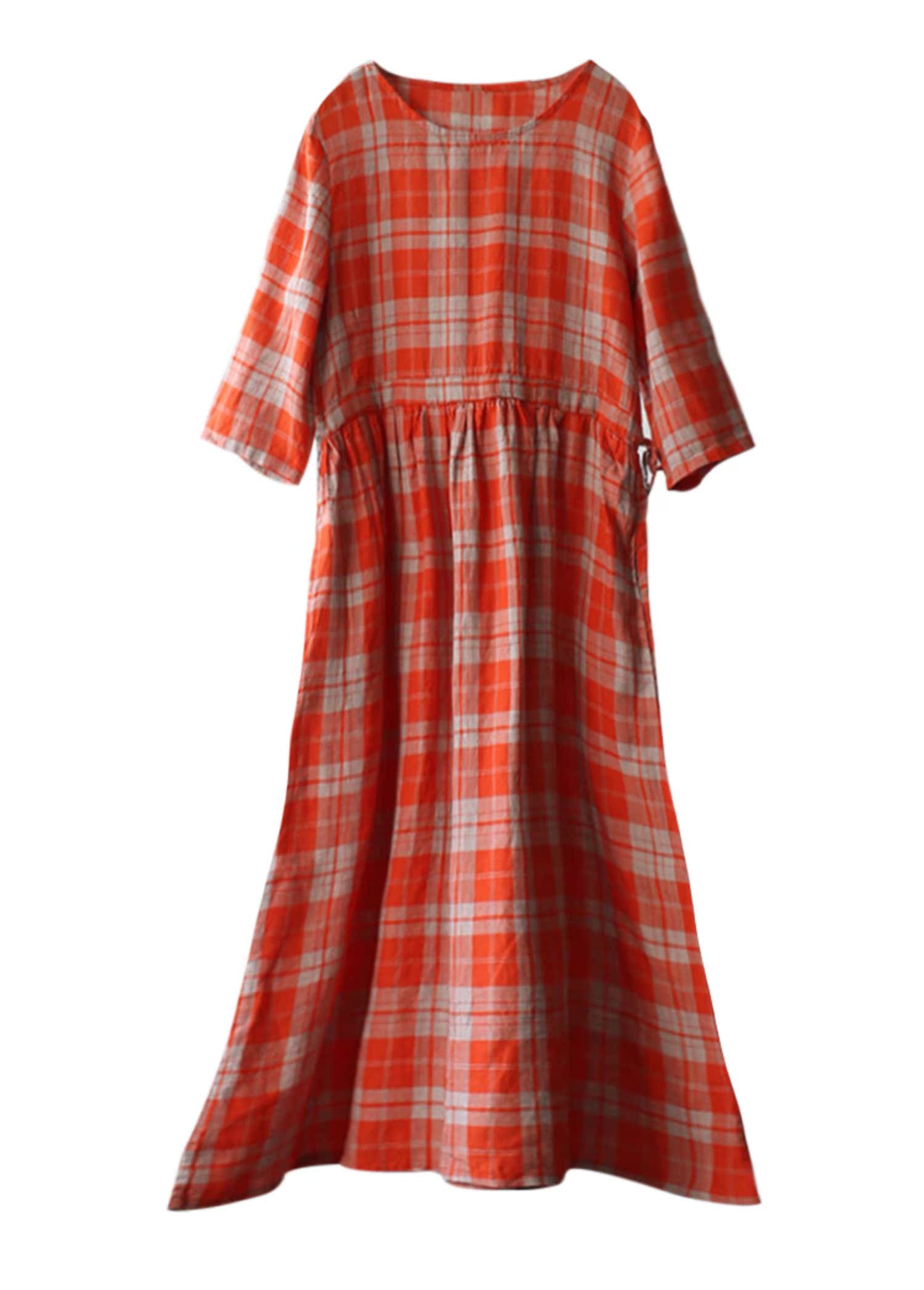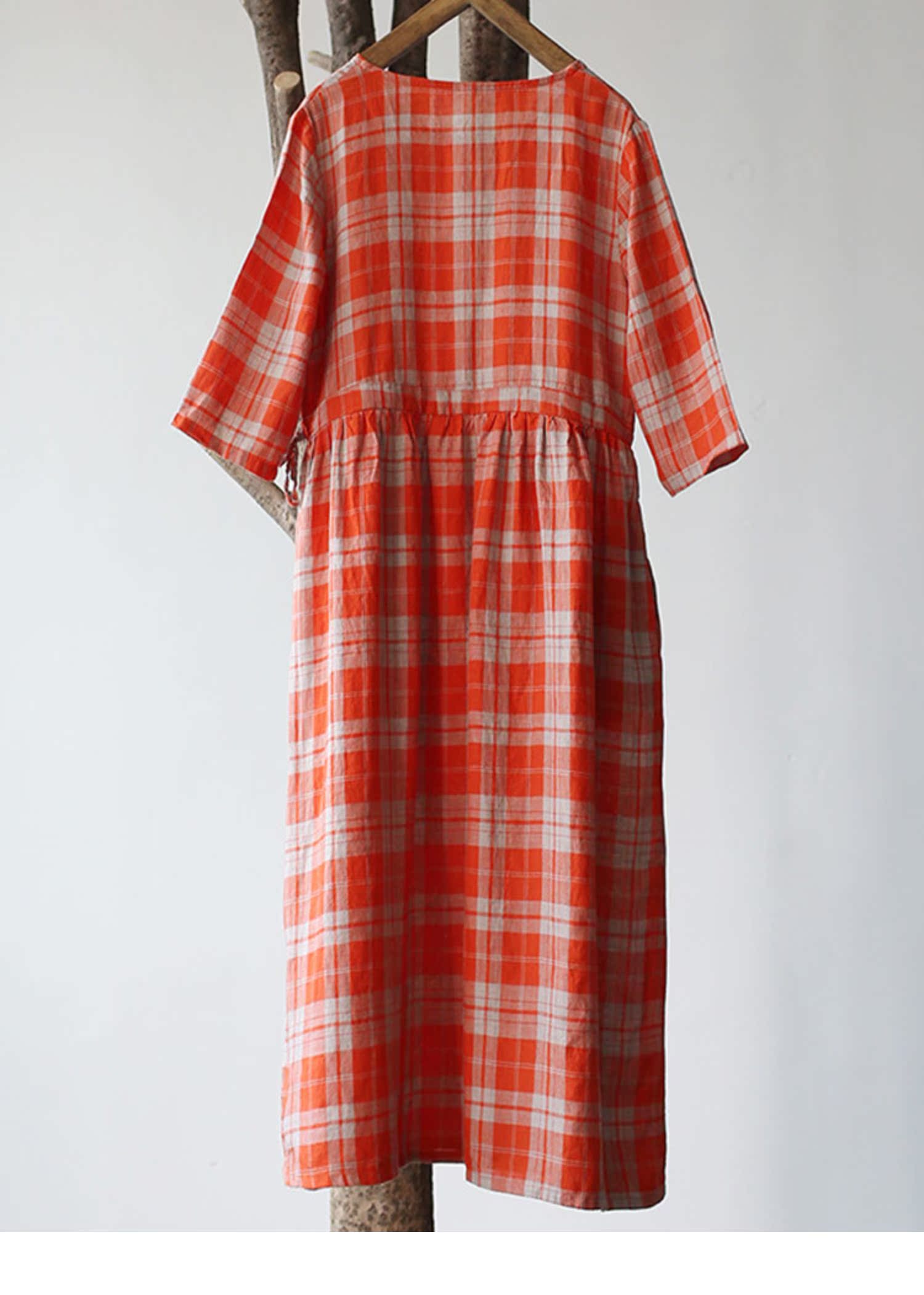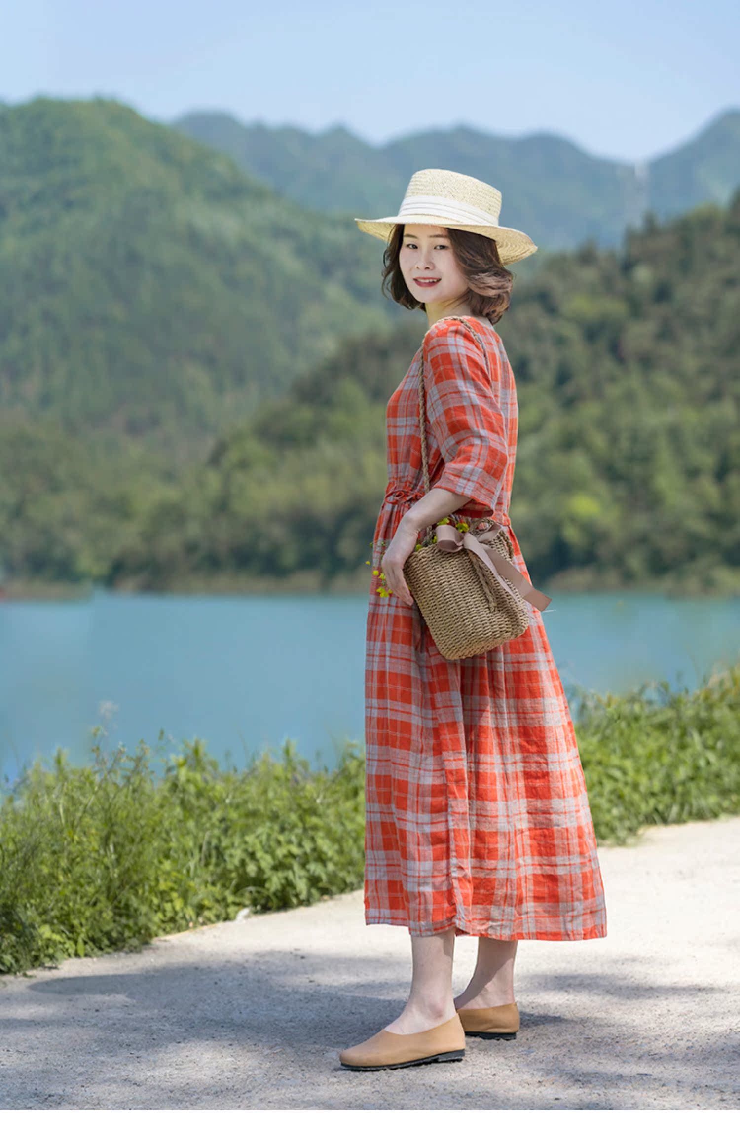 復古文藝亞麻格子連衣裙女夏款2021圓領拼接條紋長裙收腰顯瘦裙