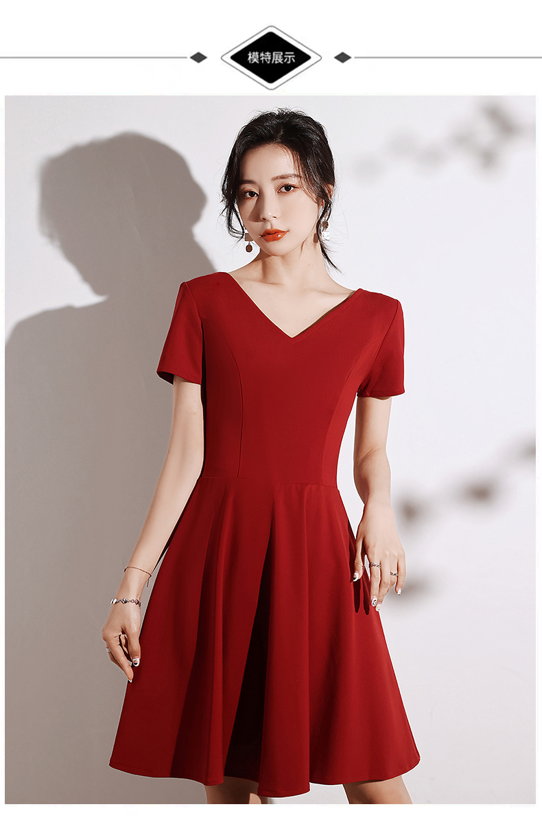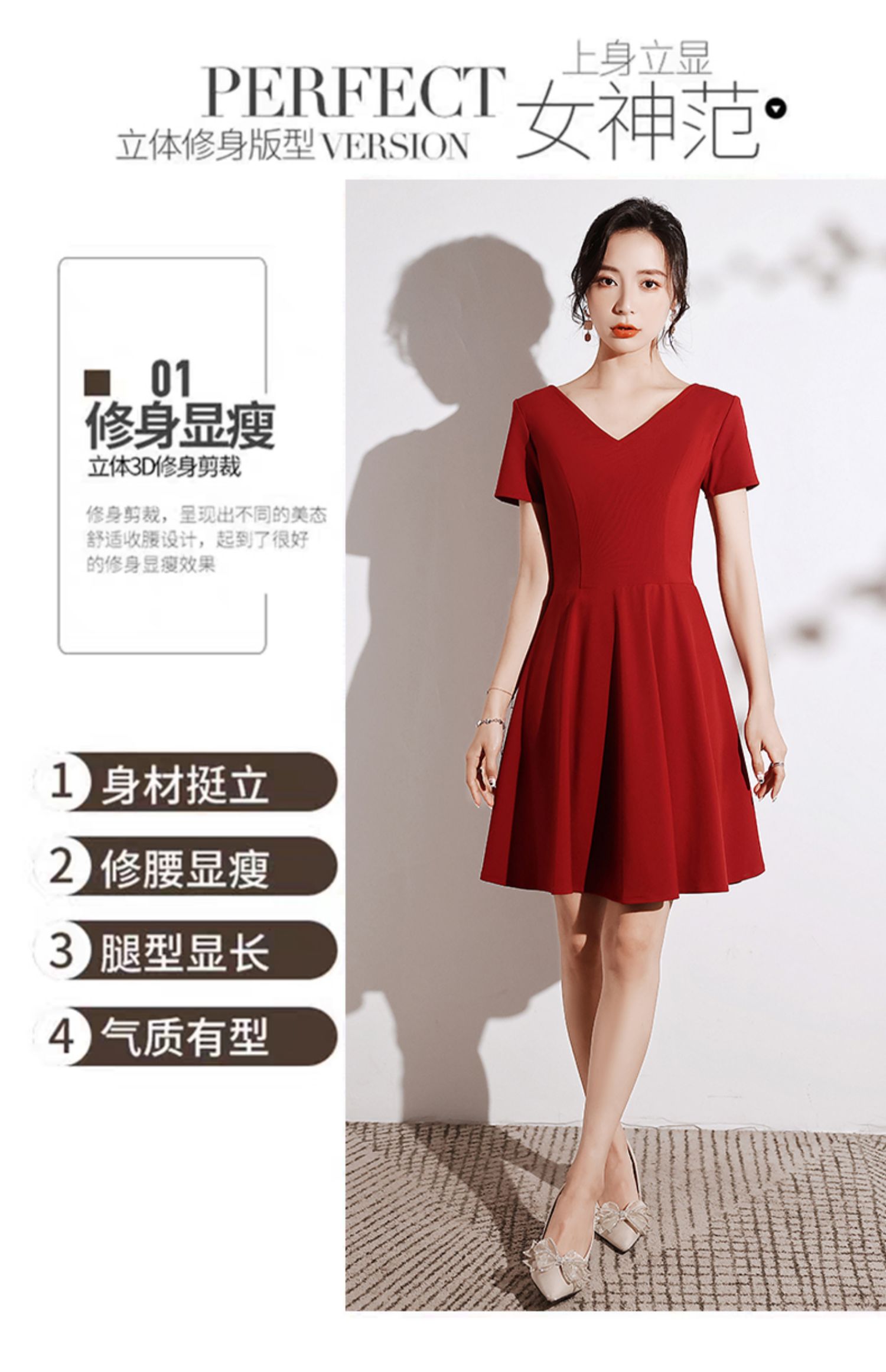 法式酒紅色V領連衣裙女秋季氣質收腰顯瘦年會小個子赫本小紅裙