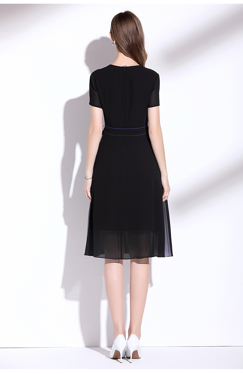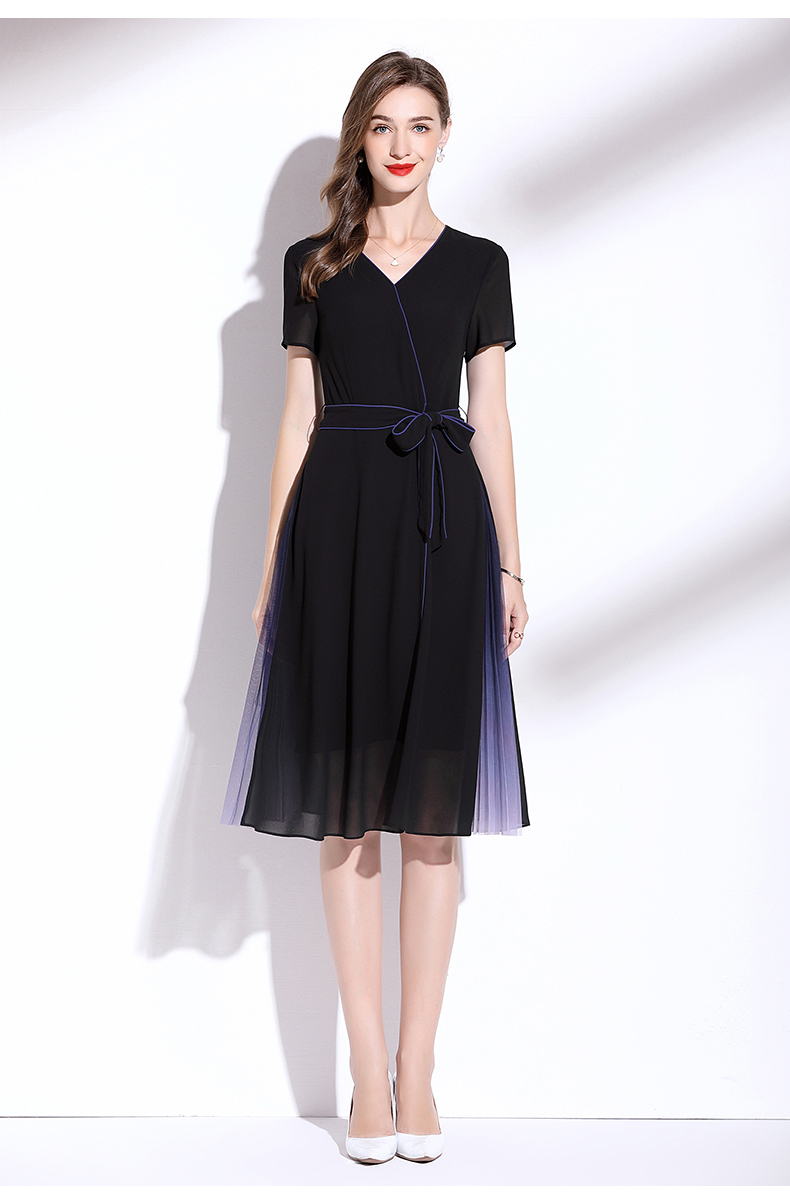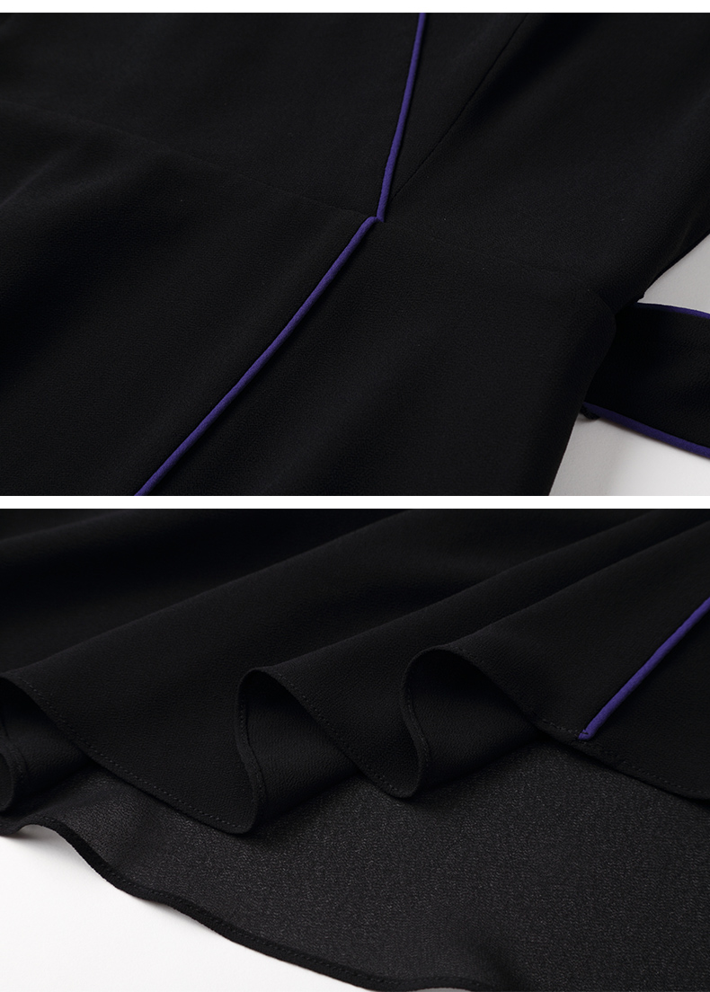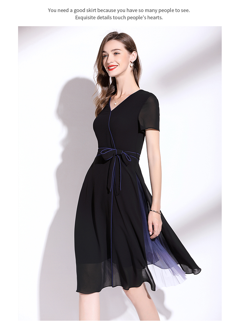 夏裝2023新款系帶收腰拼接黑色雪紡