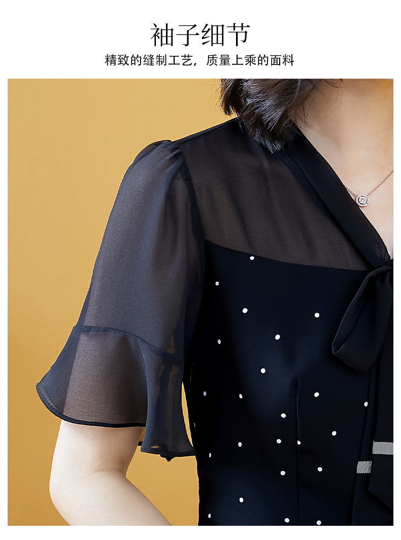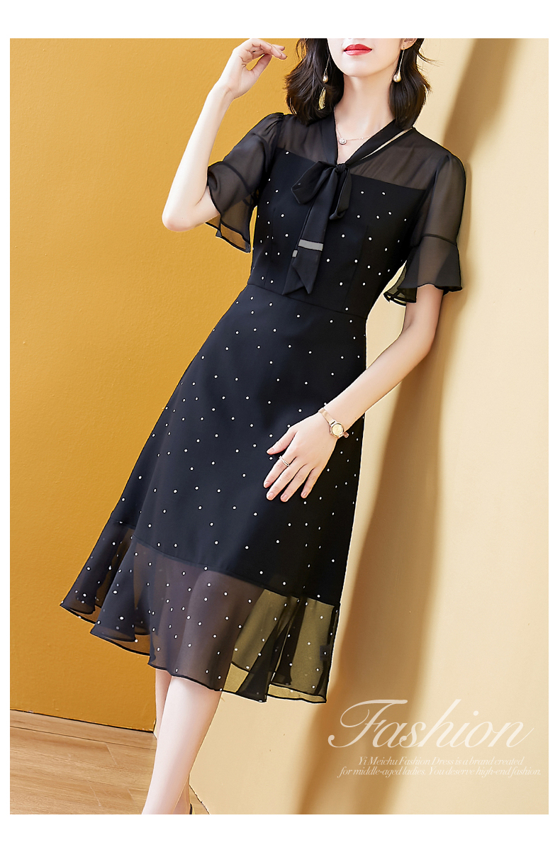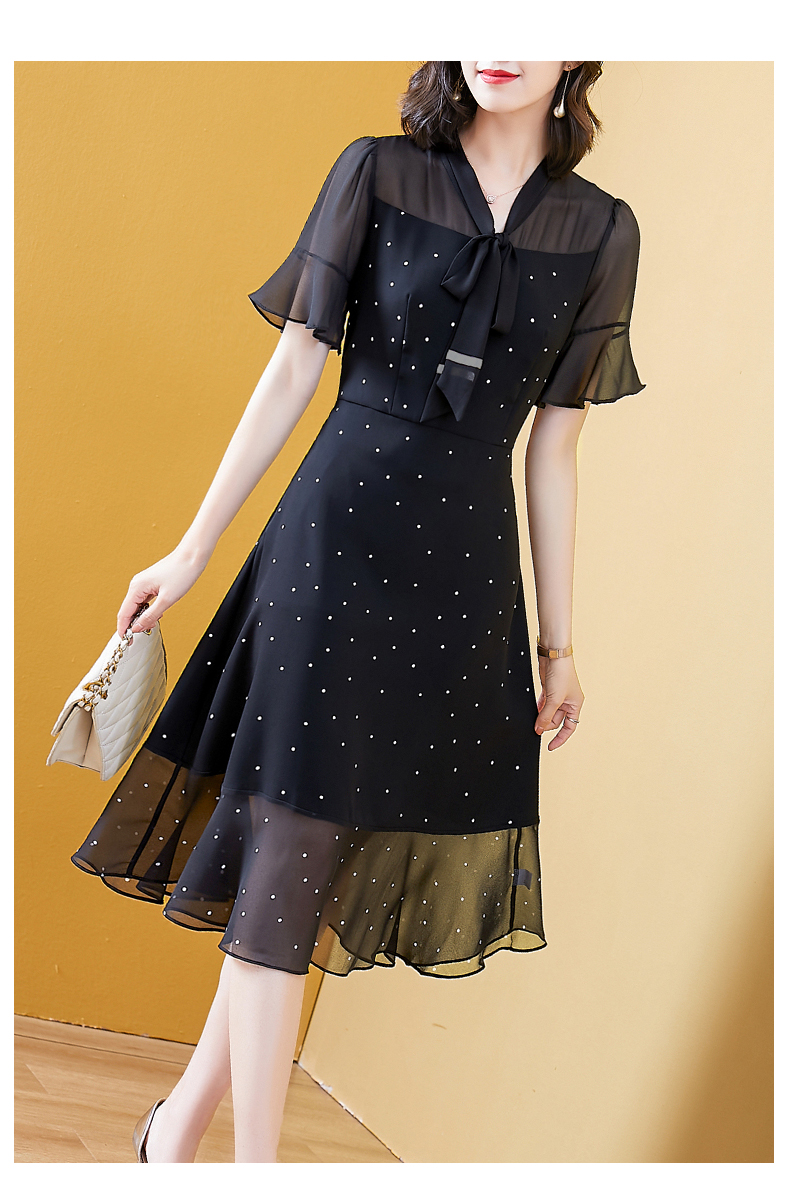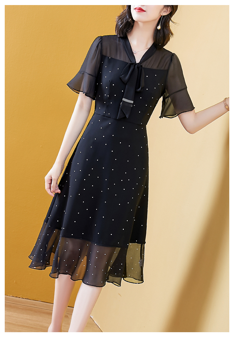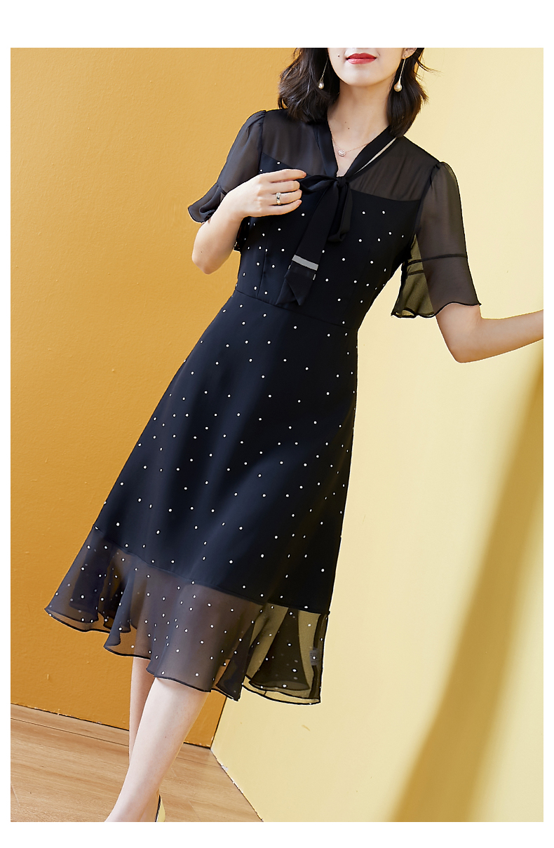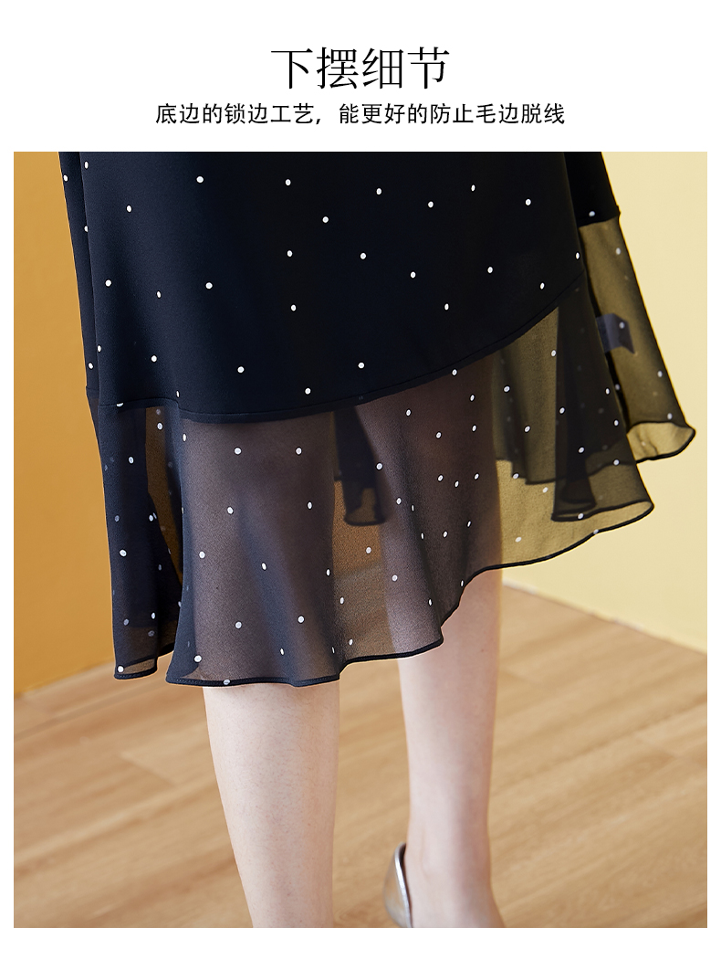 V領雪紡黑色波點連衣裙夏裝2023年新款飄逸貴夫人女顯瘦收腰a字裙