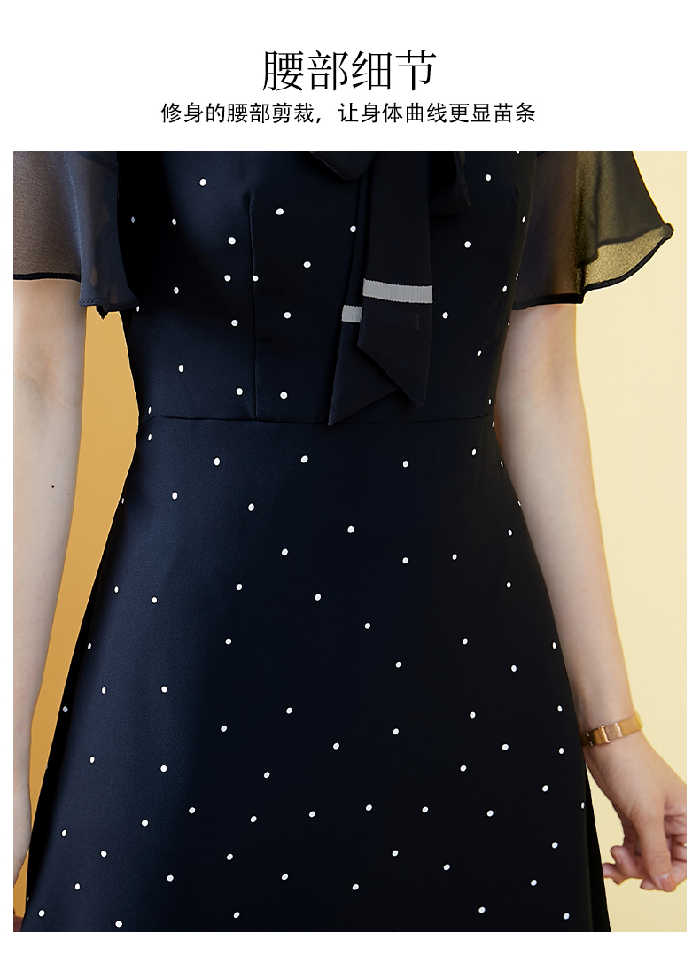易美初黑色波點連衣裙女夏2023新款圍巾領蝴蝶結休閑顯瘦復古裙