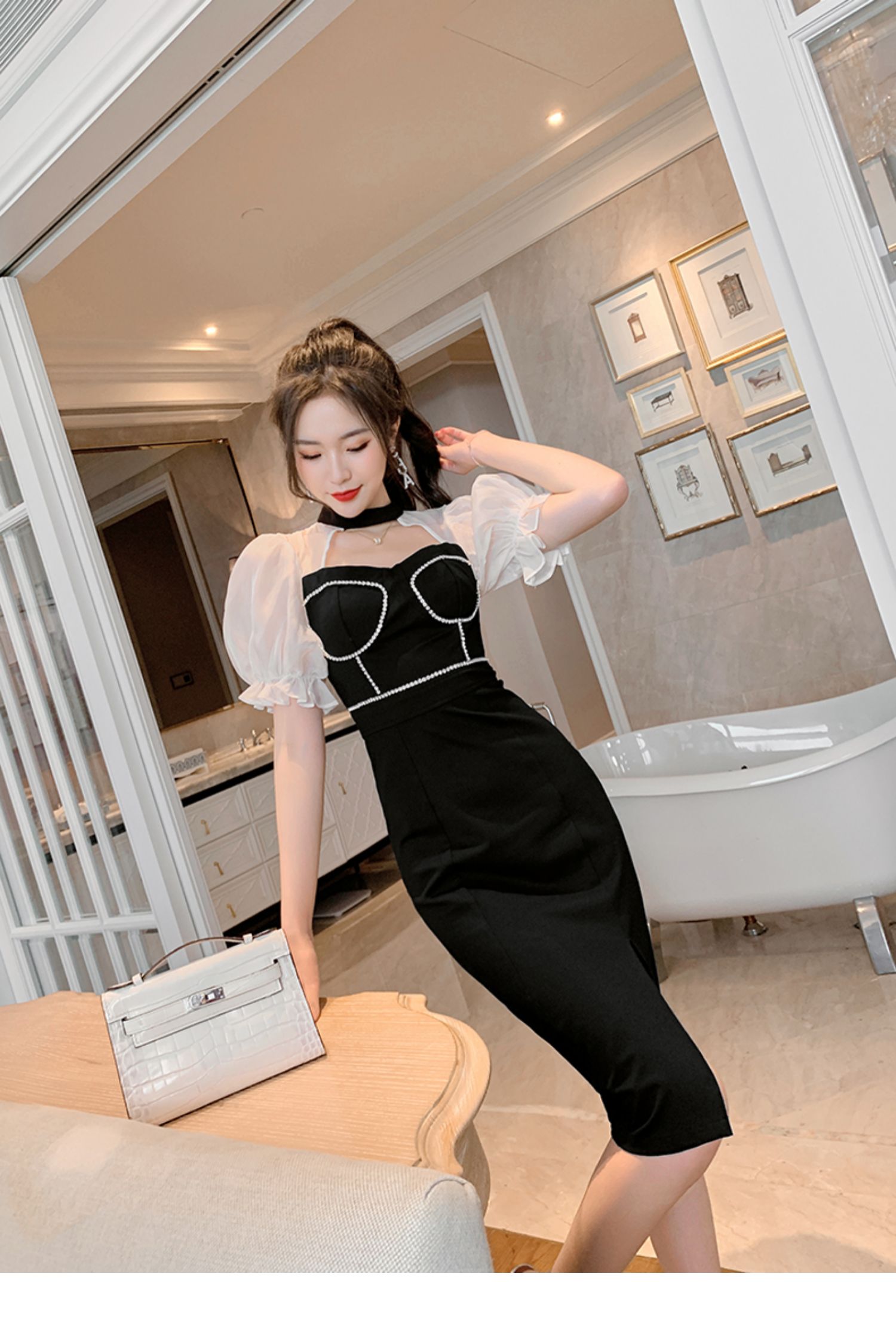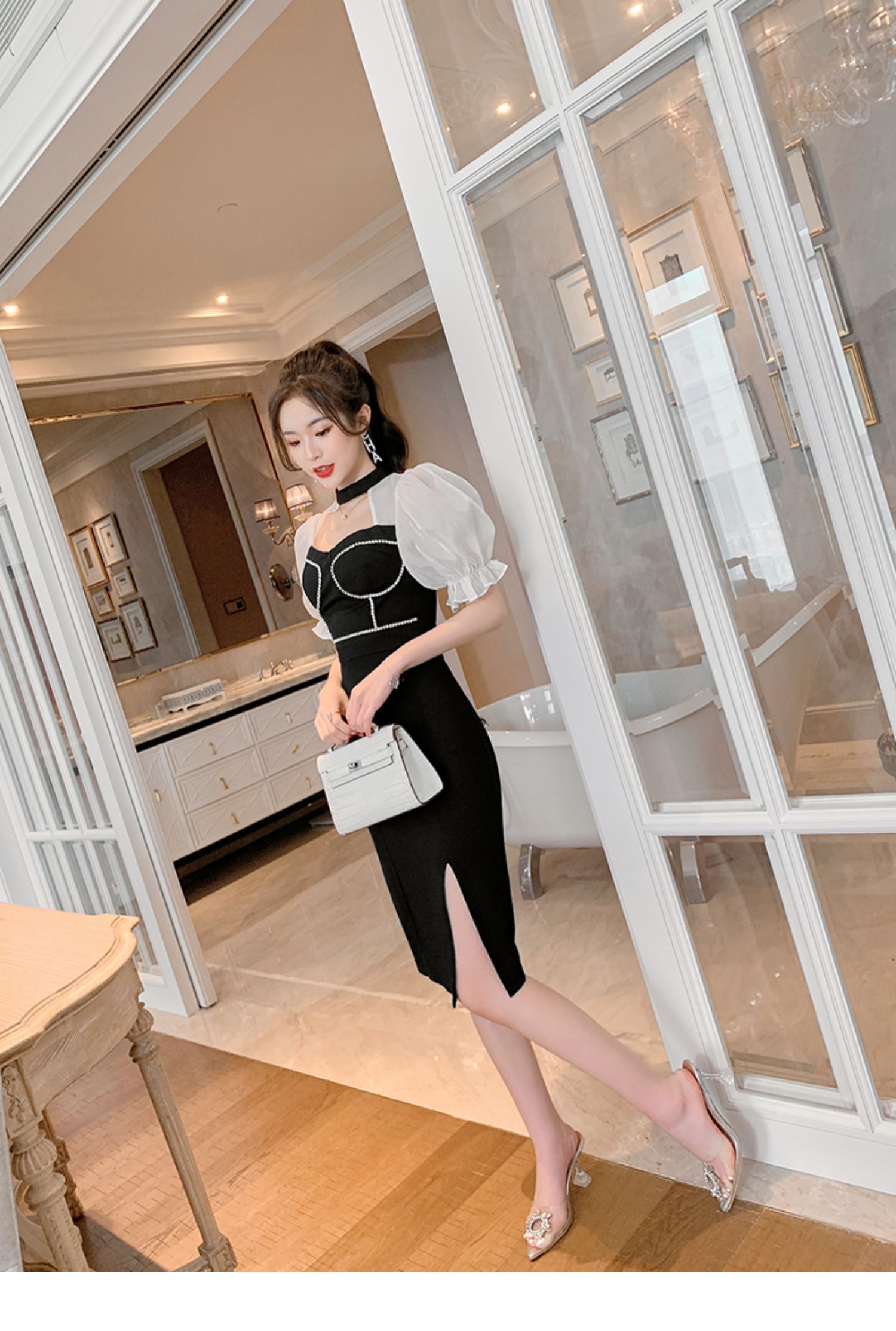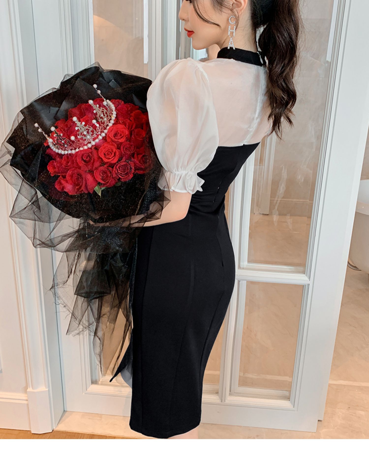 夏季新款泡泡袖修身宴會氣質連衣裙