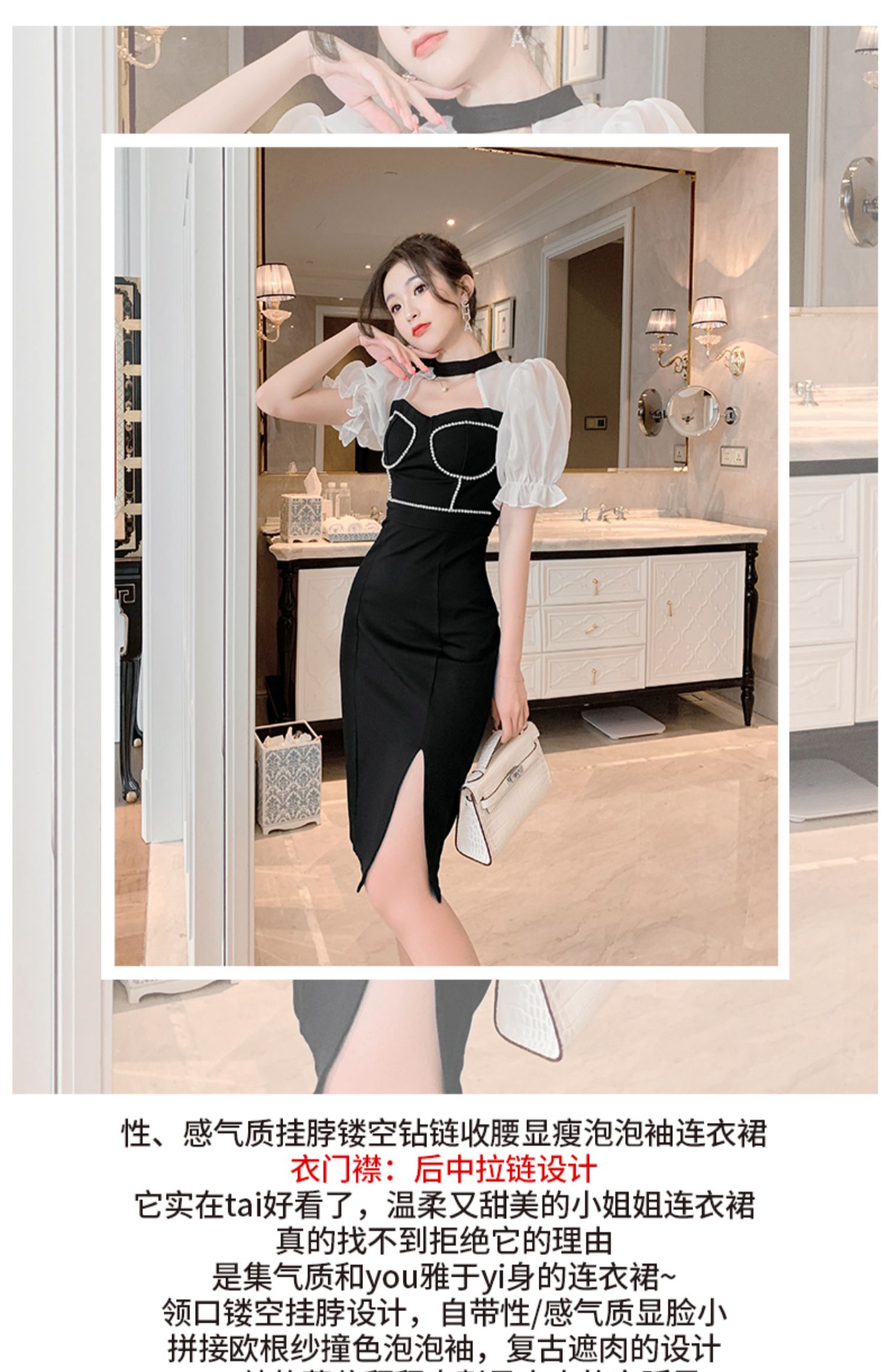 設計感小眾泡泡袖小禮服平時可穿掛脖收腰顯瘦連衣裙開叉小黑裙夏