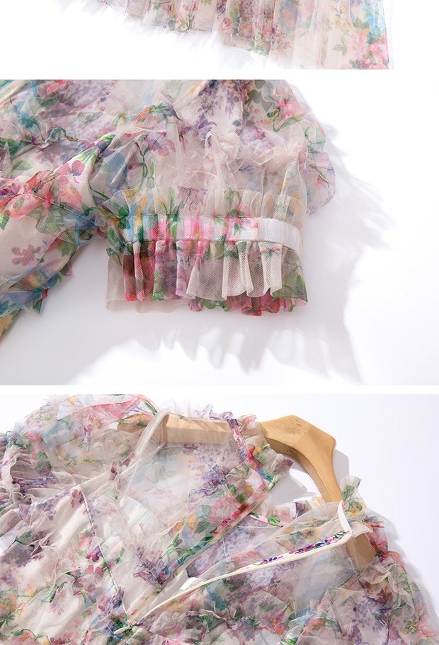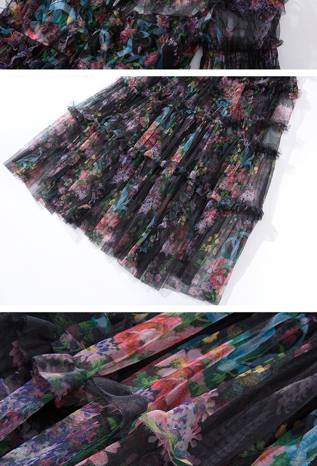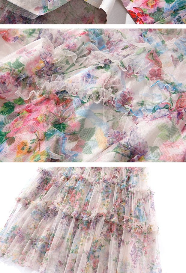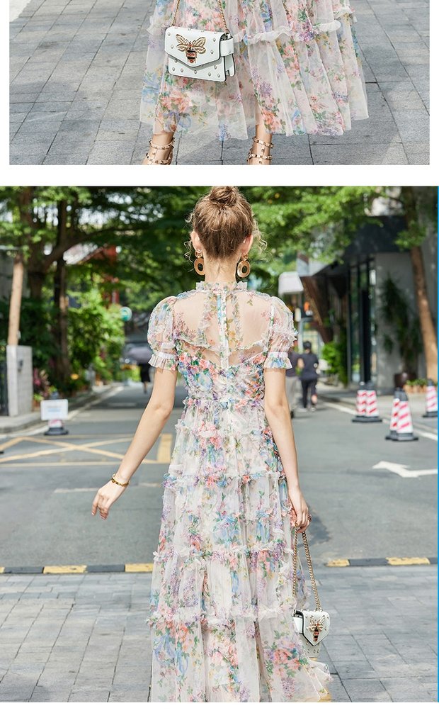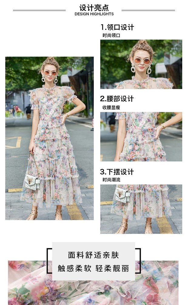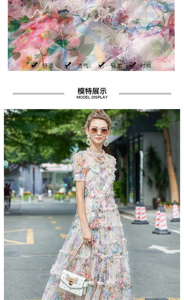 沙灘裙大擺長裙子禮服裙DIDA夏裝新款女裝網紗立體車花印花連衣裙