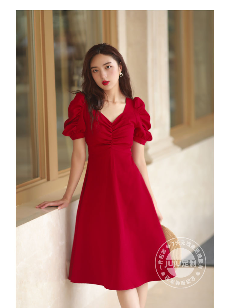 法式復古紅色連衣裙泡泡袖宮廷風初戀裙子收腰顯瘦公主裙女夏季