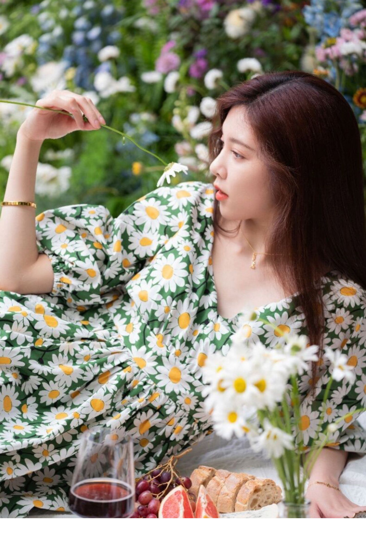 宋妍霏宋軼同款綠色雛菊v領泡泡袖連衣裙夏新法式初戀田園風長裙