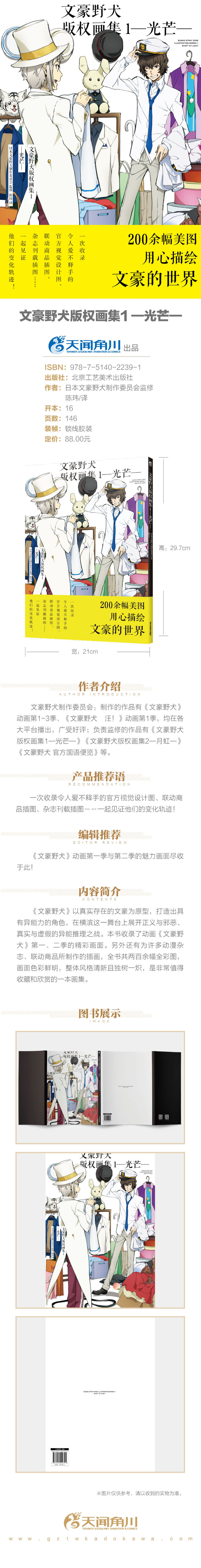 《文豪野犬》以真實存在的文豪為原型,打造出具有異能力的角色,在橫濱這一舞臺上展開正義與邪惡、真實與虛假的異能推理之戰。本書收錄了動畫《文豪野犬》第一、二季的精彩畫面。另外還有為許多動漫雜志、聯動商品所制作的插畫,全書共兩百余幅全彩圖,畫面色彩鮮明,整體風格清新且獨樹一熾,是非常值得收藏和欣賞的一本畫集。