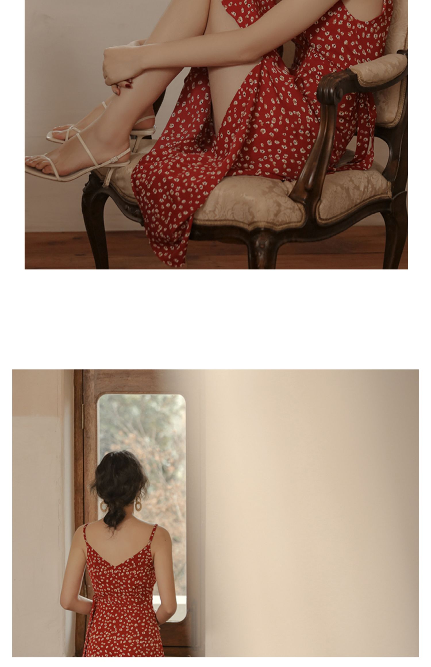 彌古法式紅色碎花吊帶高級感沙灘裙
