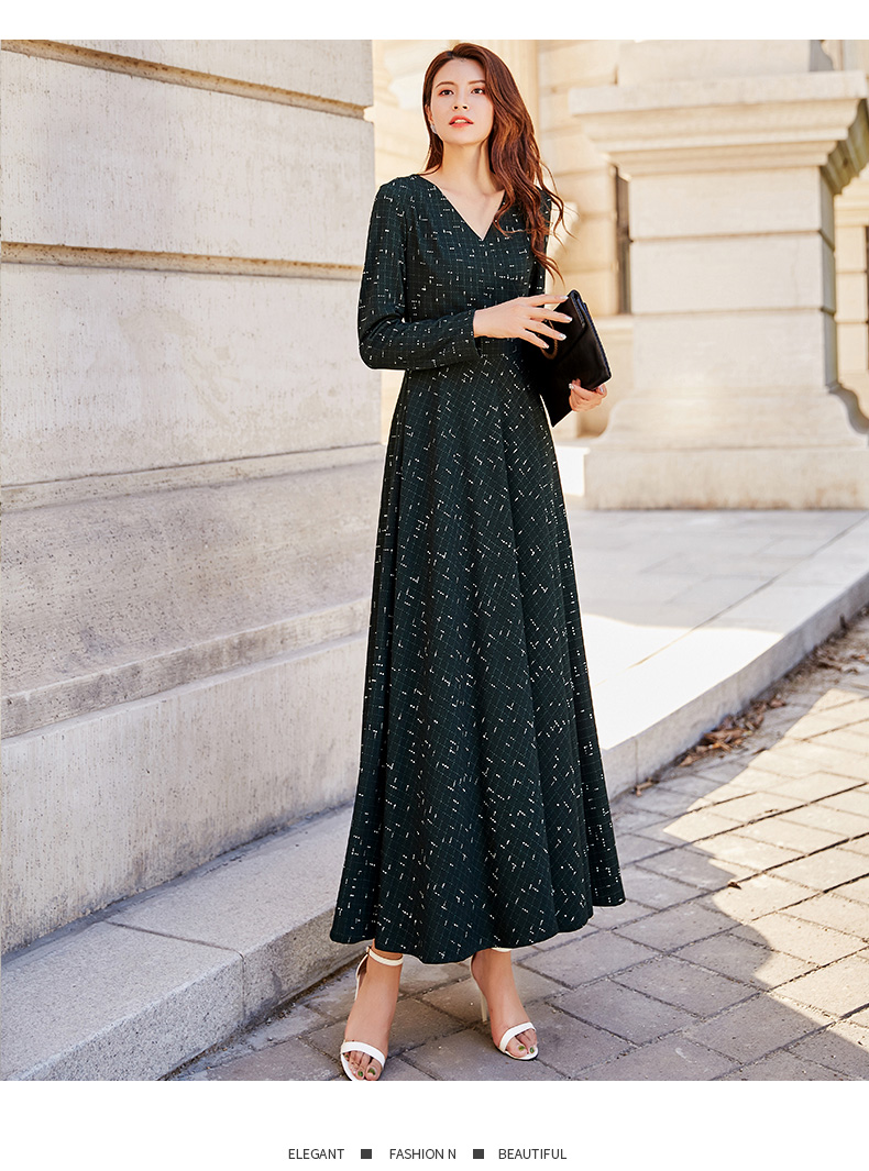 春秋綠色長袖連衣裙女長款到腳踝2023新款超長新中式印花大擺裙子