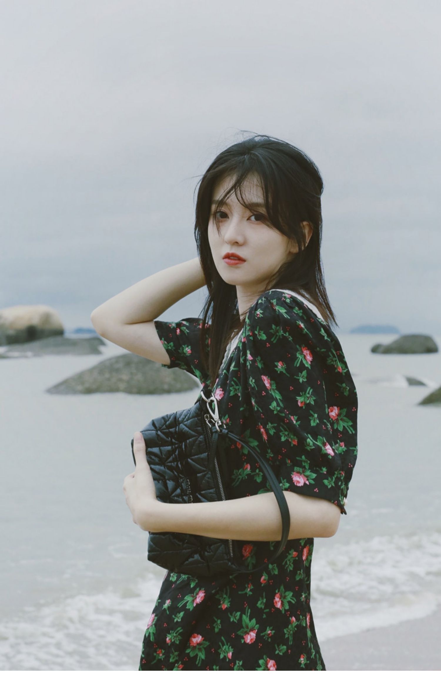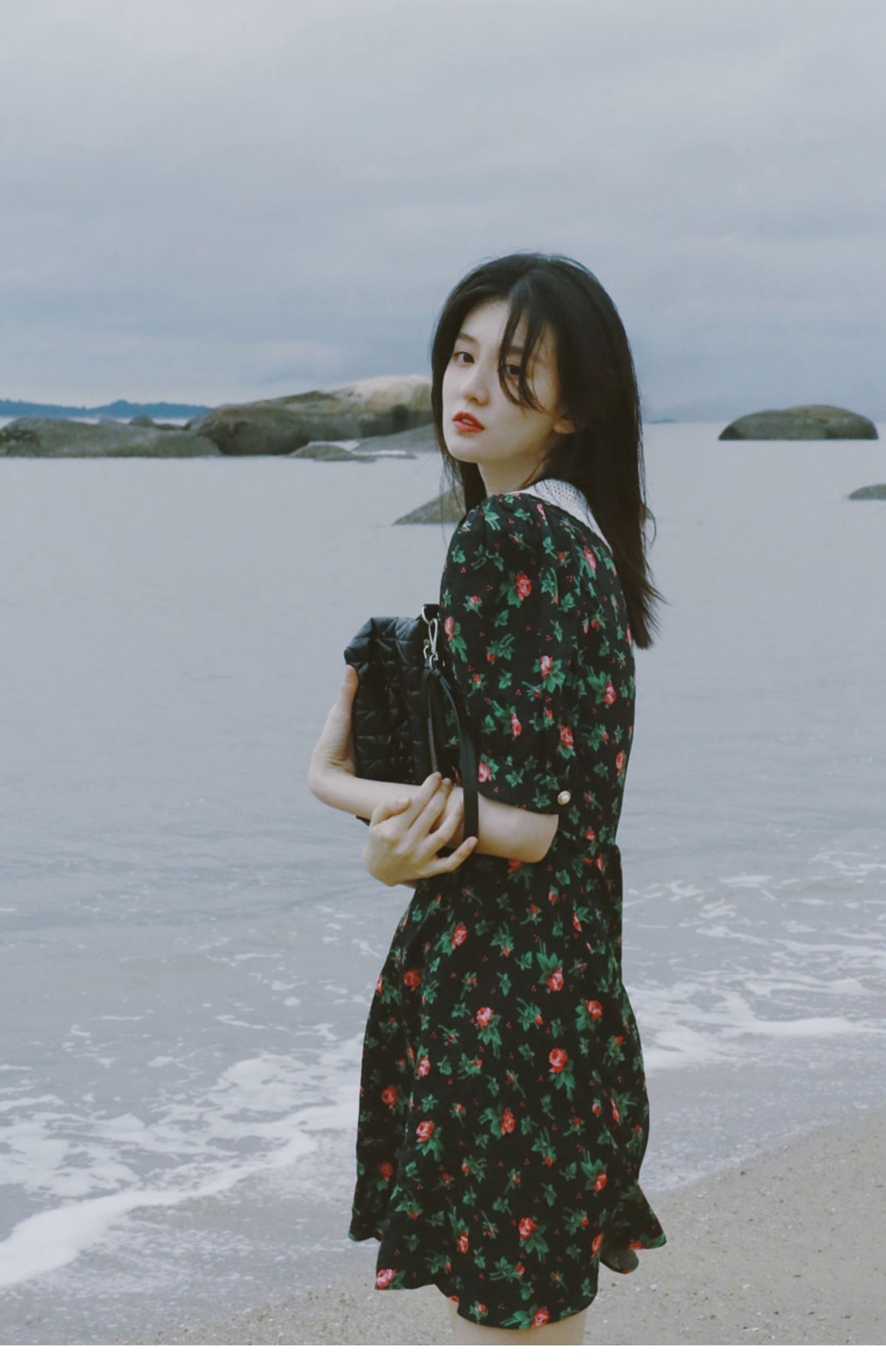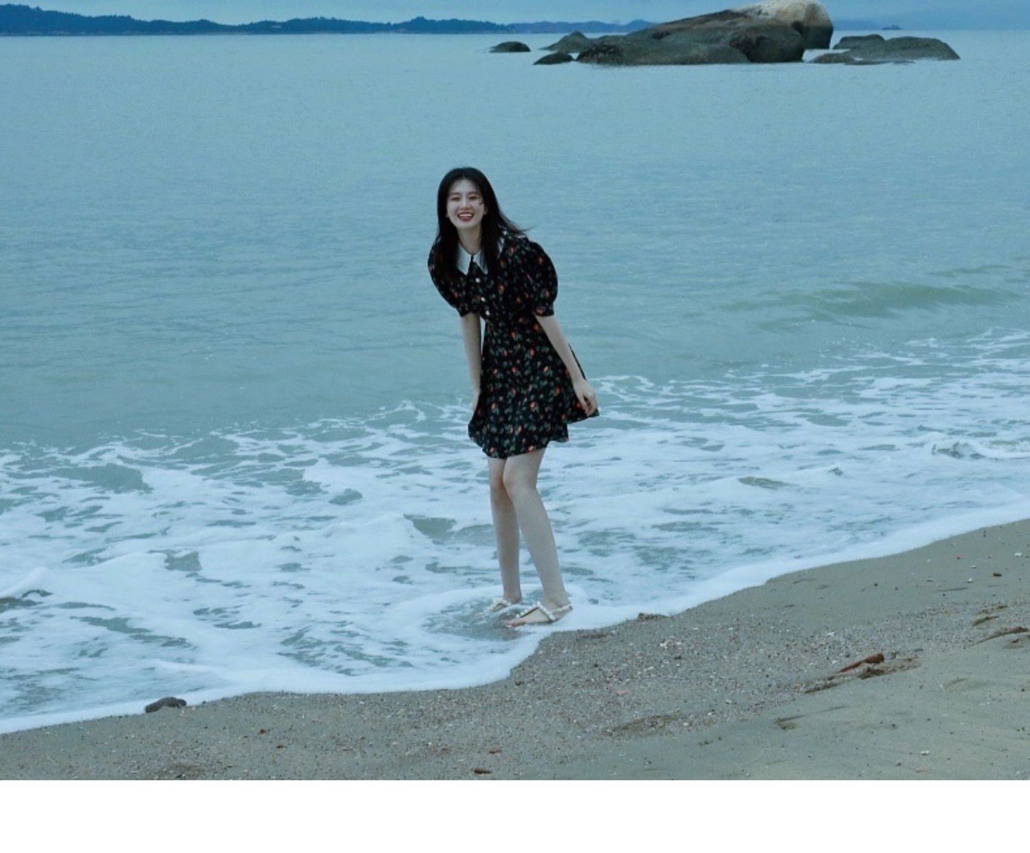 金晨明星黑色印花v領2021新款短裙