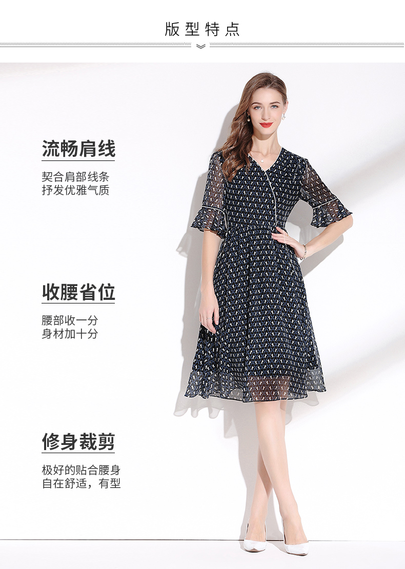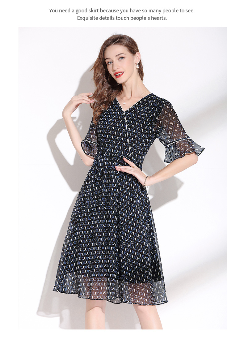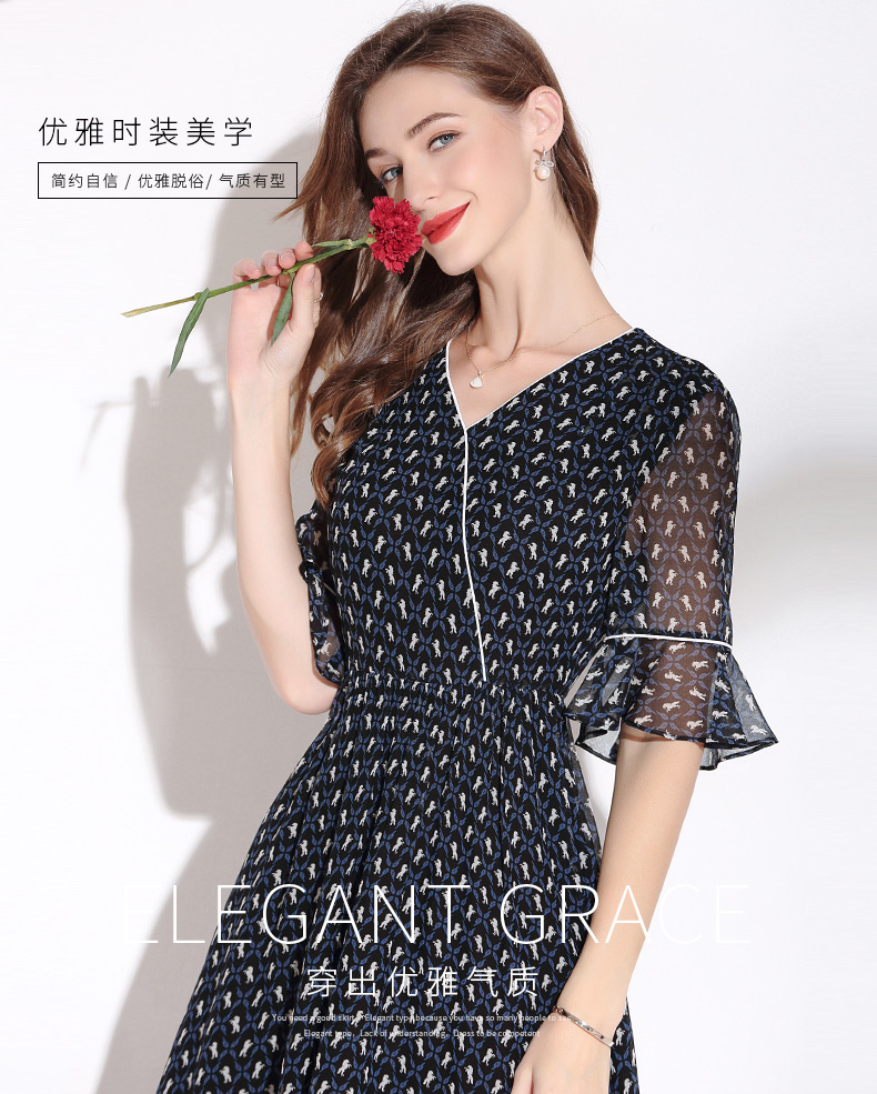 2023新款雪紡連衣裙夏季薄款v領喇叭袖氣質減齡顯瘦遮肚印花裙夏