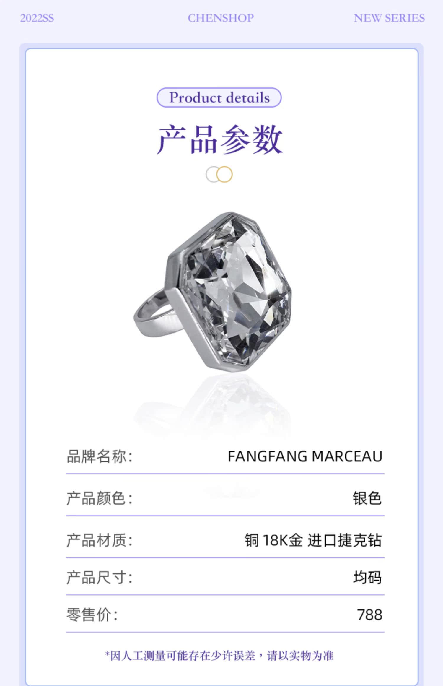 戚薇同款CHENSHOP設計師品牌FANGFANGMARCEAU時尚大寶石戒指新品