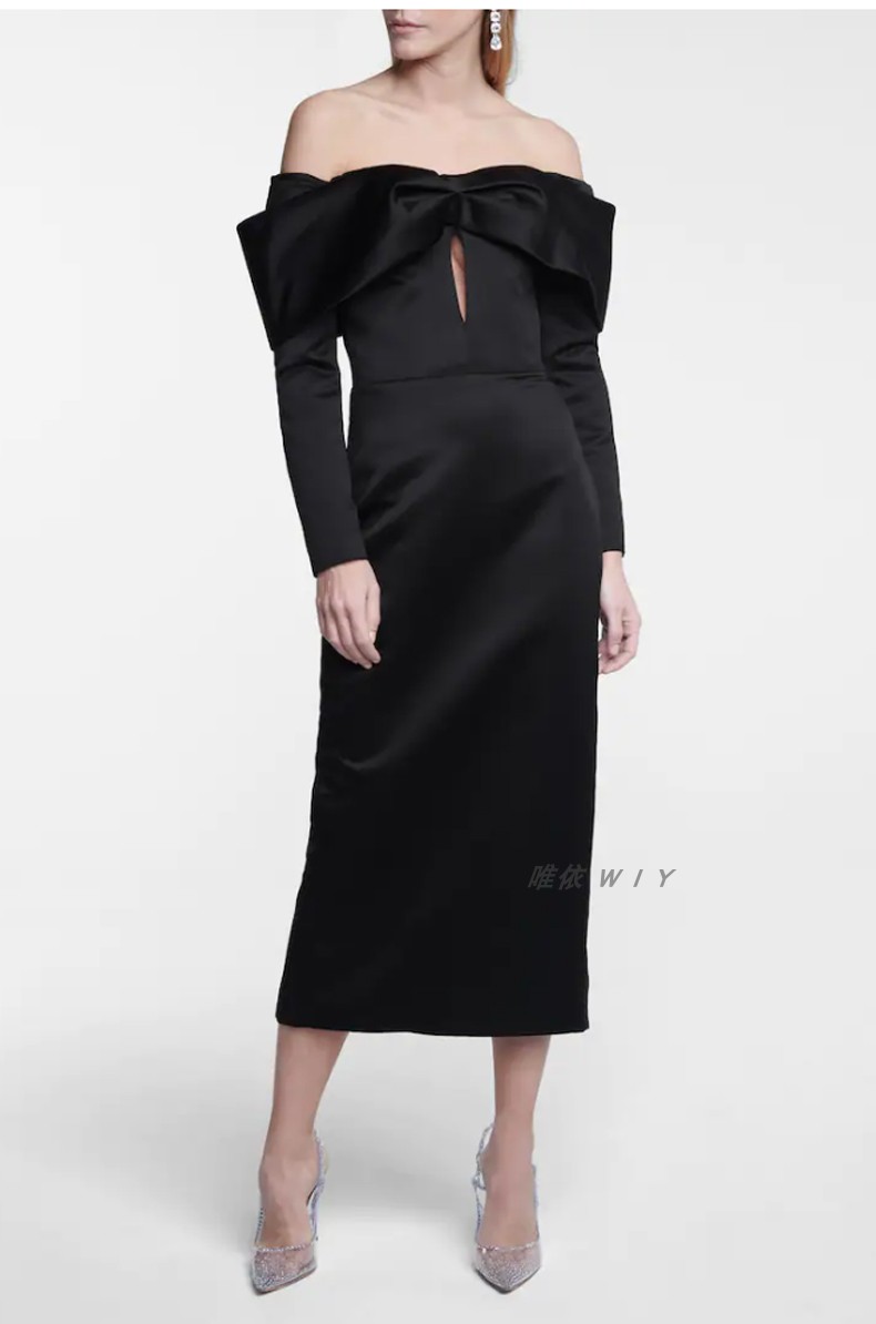 時尚晚禮服2023新款年會女一字肩中長裙主持人宴會顯瘦連衣裙高端
