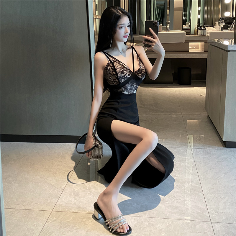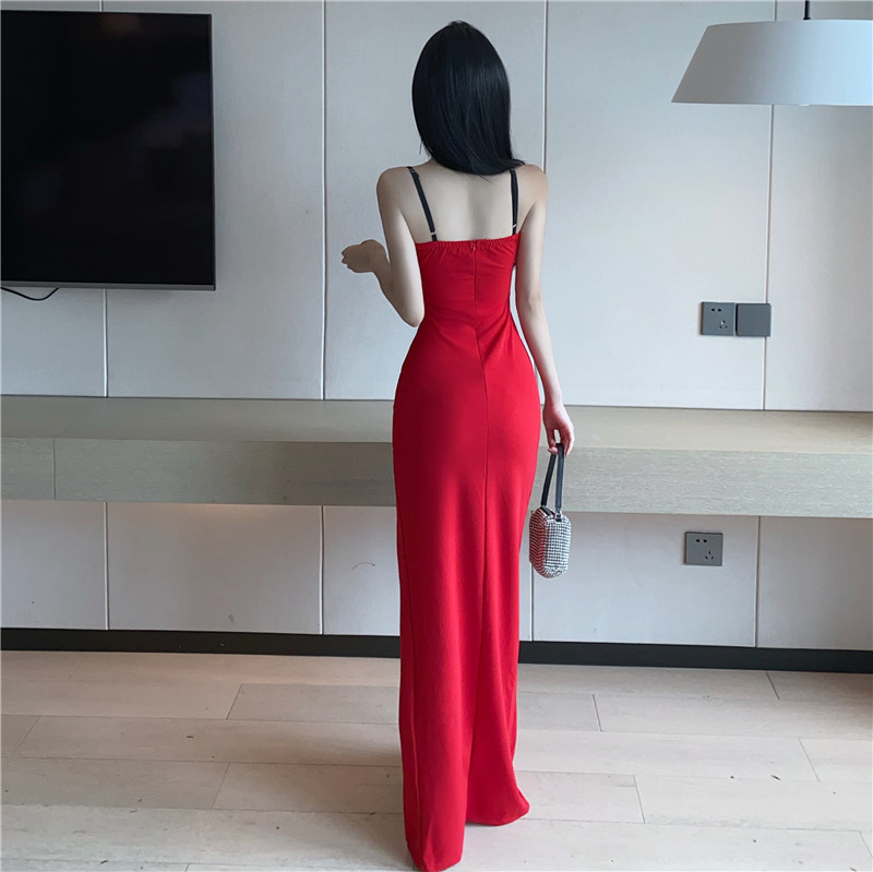 性感晚禮服長裙女高端氣質名媛深V領露背收腰顯瘦開叉吊帶連衣裙