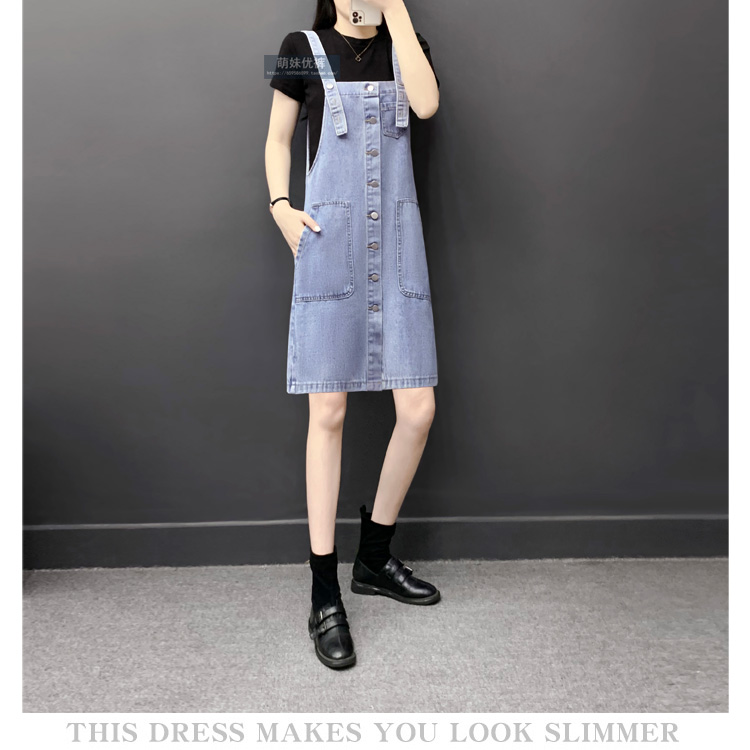 2023秋裙新款加大碼減齡百搭背帶牛仔長裙寬松吊帶連衣裙排扣潮裙