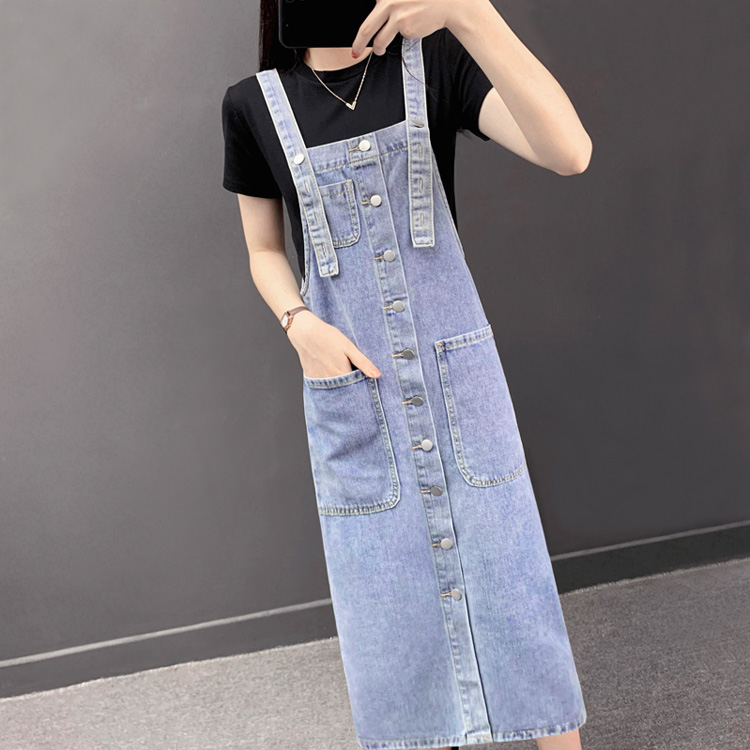 2023中長裙新款秋季大碼百搭寬松收腰背帶長裙牛仔吊帶a字連衣裙