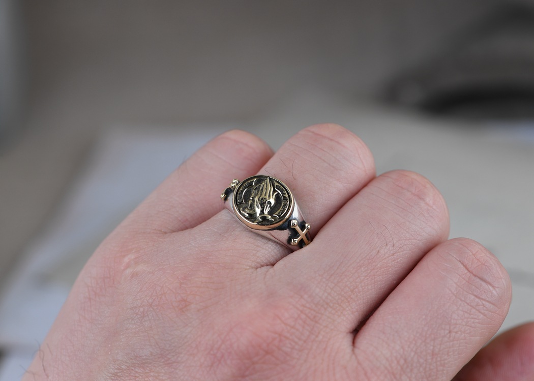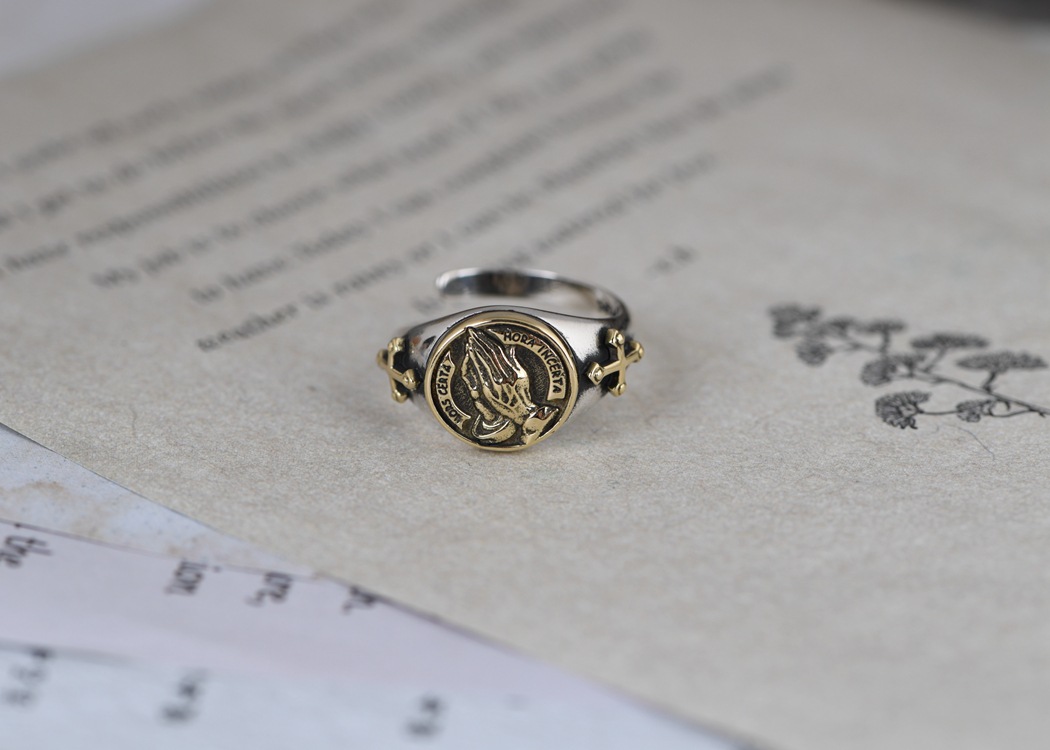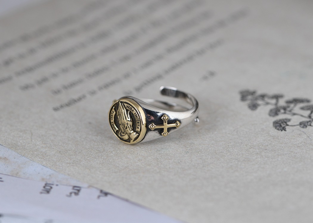 純銀戒指S925銀復古十字架銀飾祈禱之手泰銀指環歐美戒子男女開口