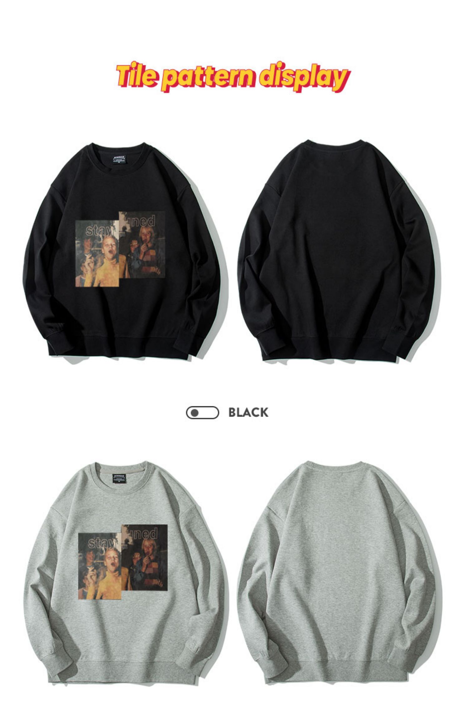 美式復古印花套頭圓領衛衣女秋季加絨寬松無帽早秋黑色大碼上衣潮