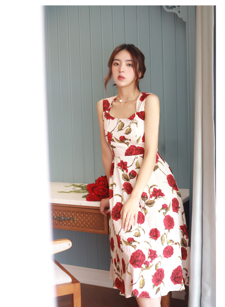 法式浪漫吊帶裙玫瑰花連衣裙方領無袖背心裙優雅A字裙復古少女夏